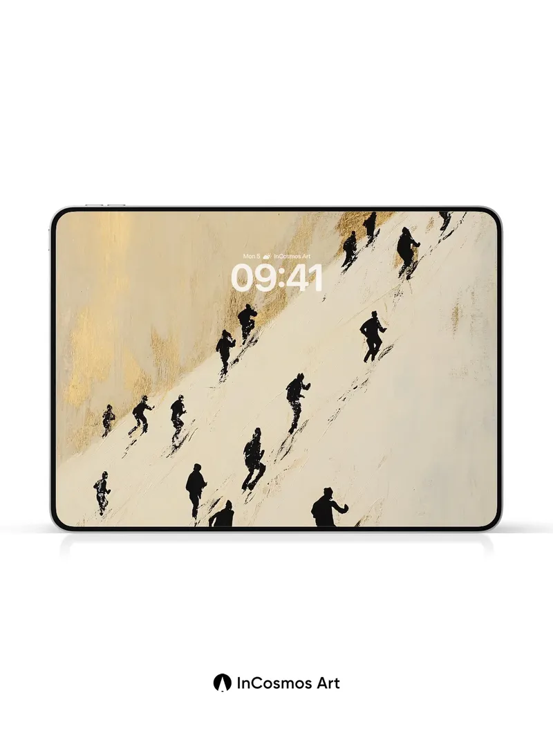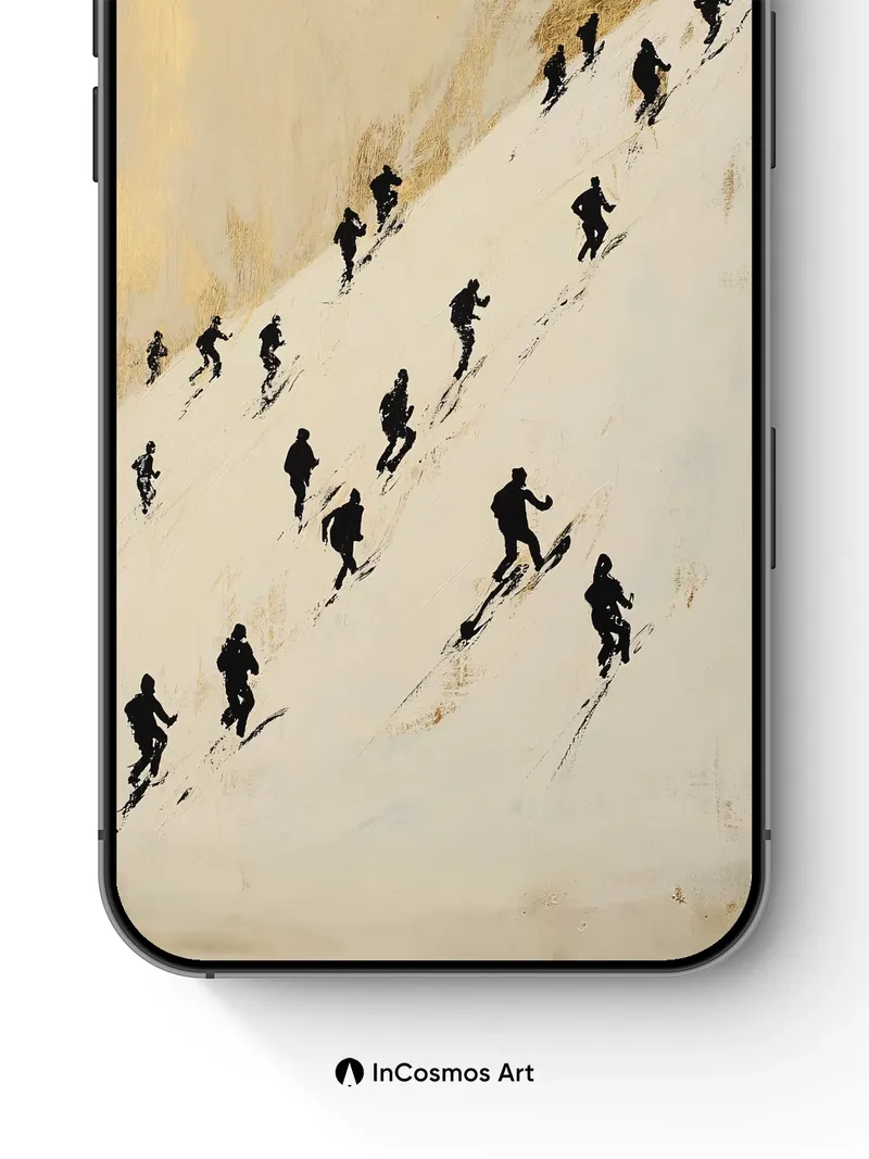 Debug page_description: Did you know that the first ski tracks were etched into snow over 5,000 years ago in Scandinavia? Here, shadowed figures carve through a slope where light breathes softly across textured cream and gold—each stride a quiet rebellion against stillness. The sky hums with the warmth of dawn, while the mountain’s edge glows like brushed metal, framing movement as both ritual and release. Share this with your best friend. Send this to your love and swap a matching set. What if every step upward left a trace only the wind could read?
