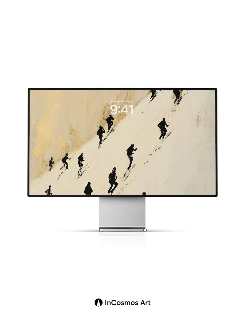 Debug product.metafields.custom.desc: Did you know that the first ski tracks were etched into snow over 5,000 years ago in Scandinavia? Here, shadowed figures carve through a slope where light breathes softly across textured cream and gold—each stride a quiet rebellion against stillness. The sky hums with the warmth of dawn, while the mountain’s edge glows like brushed metal, framing movement as both ritual and release.