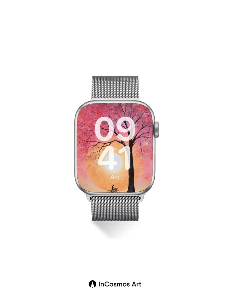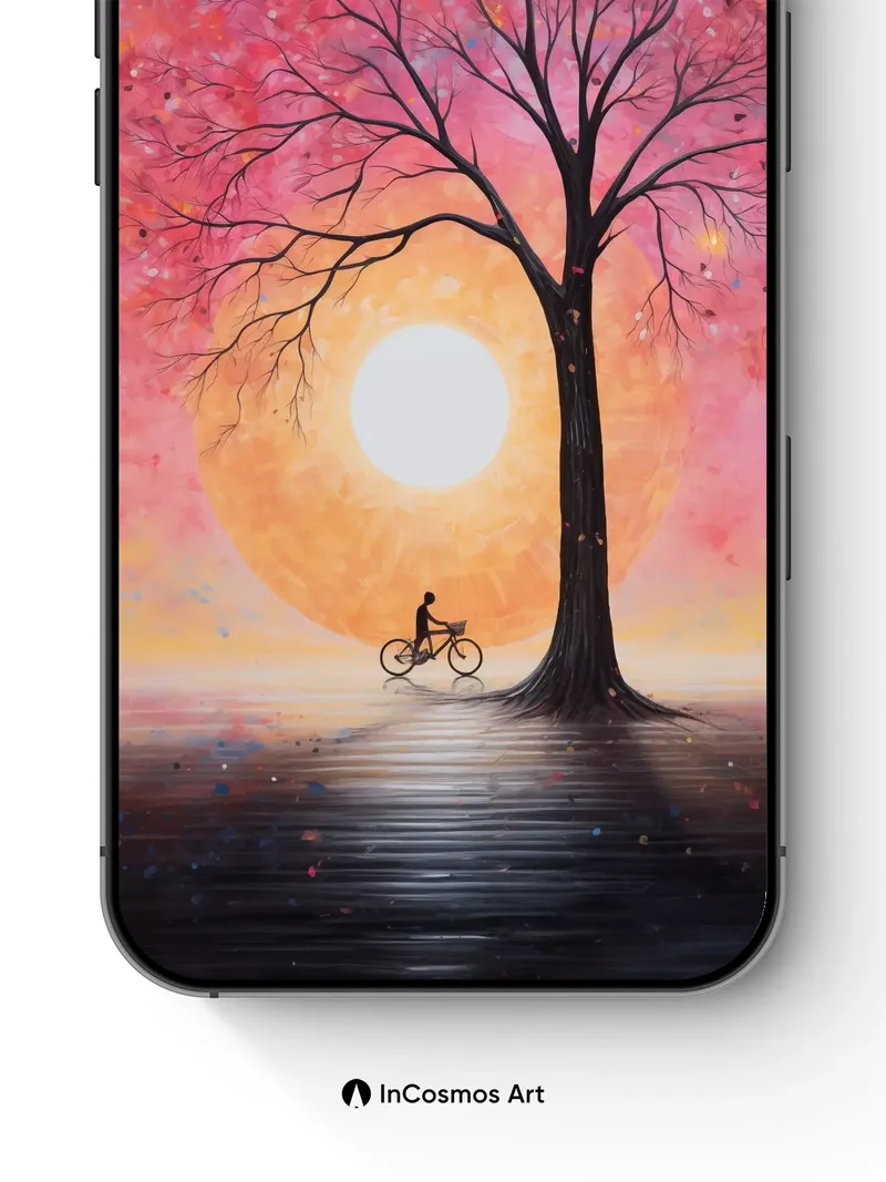 Debug page_description: Did you know the color crimson once symbolized both passion and mourning in ancient Persian art? Here, it bleeds across a sky like liquid dusk, where a bare tree stands rooted in still water, its branches reaching into a galaxy of stardust. A lone cyclist pedals toward the horizon, their shadow stretching long beneath a sun that pulses like a heartbeat—this moment is not just seen, but felt. Share this with your best friend. Send this to your love and swap a matching set. What if every sunset held a secret only your soul could hear?