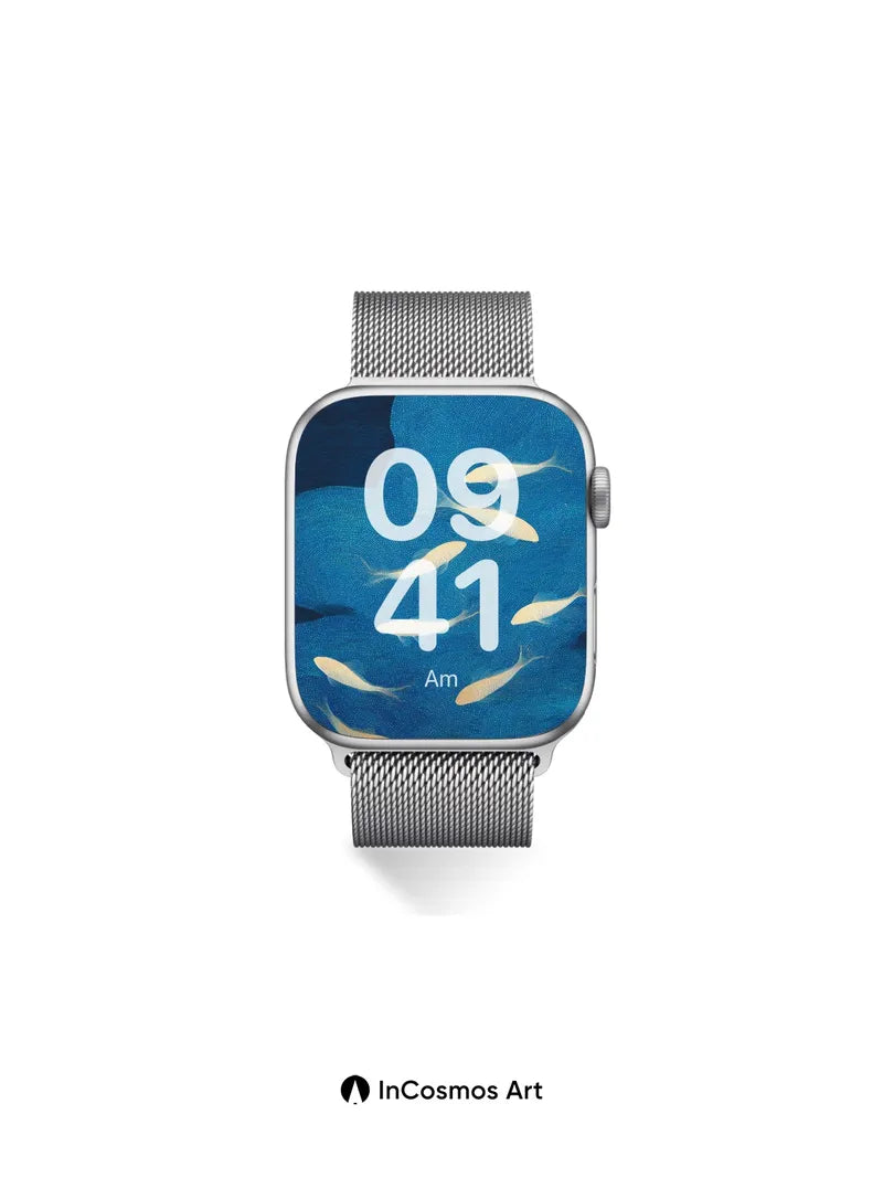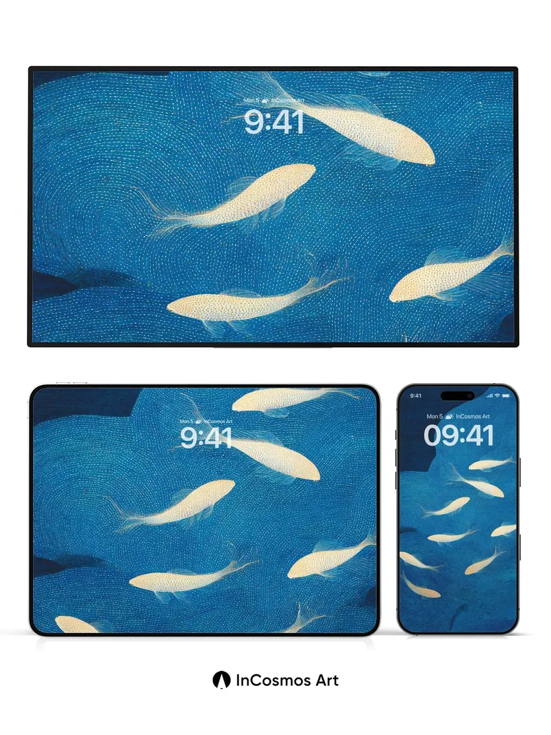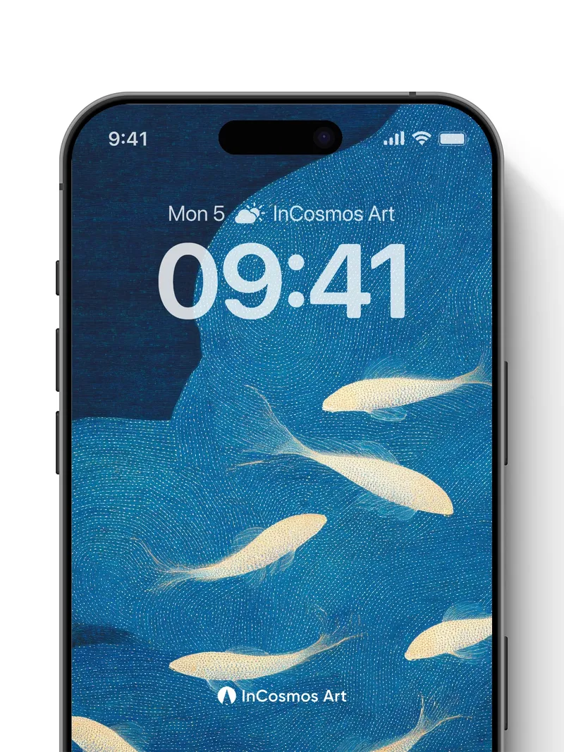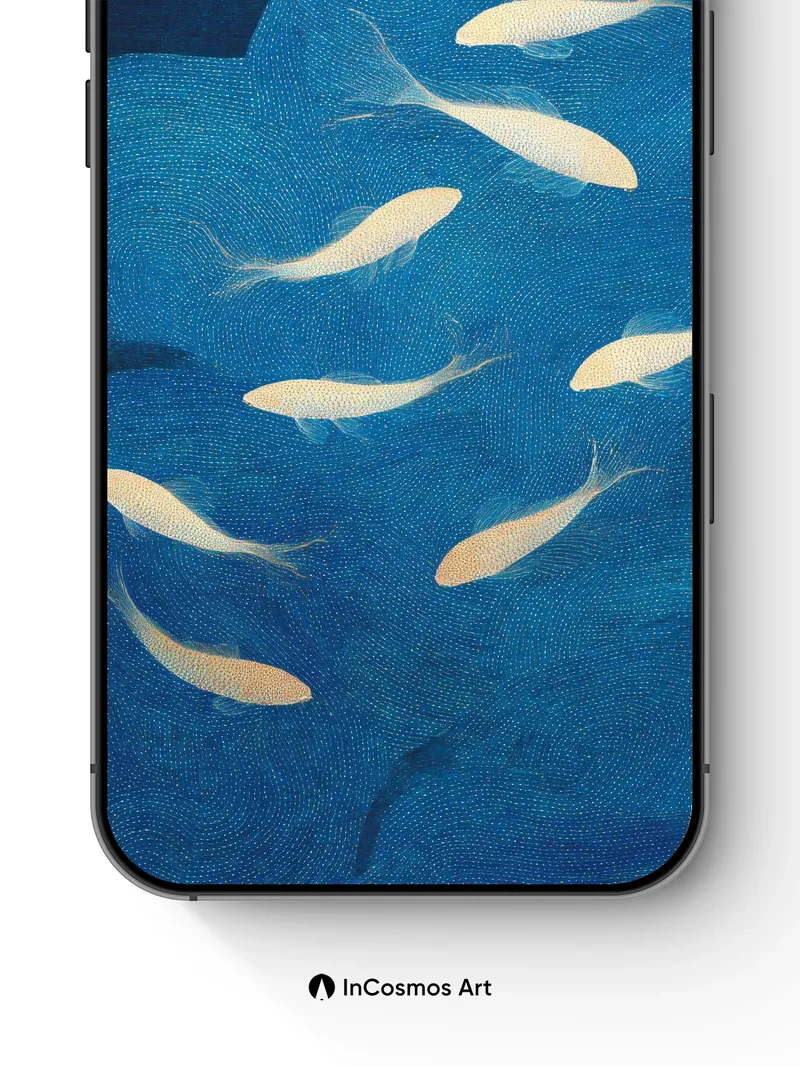 Did you know that in ancient Japanese art, fish were symbols of perseverance and transformation? Here, pale silver forms glide through a deep indigo field woven like wet silk, each scale catching the faintest light as if breathing underwater. The texture hums with quiet movement—like a slow current beneath a moonlit sea—where color doesn’t just sit, it flows.