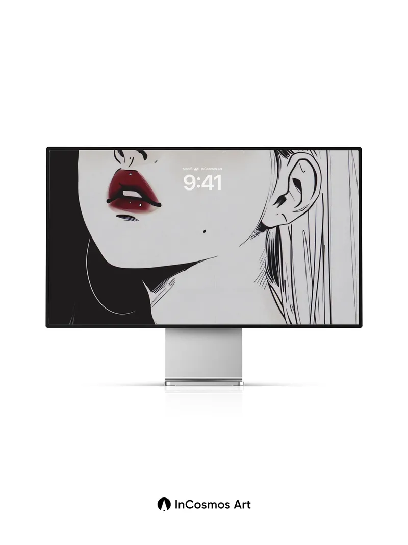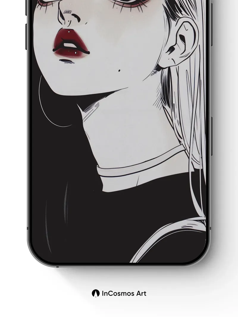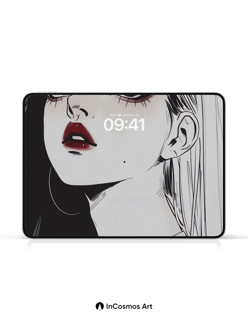 Debug page_description: Did you know that in traditional Japanese ink painting, the absence of color speaks louder than any hue? Here, light crawls over stark lines and smooth skin like a whisper across silk, while a single drop of crimson breaks the silence—bold, deliberate, alive. The contrast between shadowed hair and luminous cheekbones creates a quiet tension, as if the portrait is holding its breath. Share this with your best friend. Send this to your love and swap a matching set. What would you say to the girl who stares back from the wall?