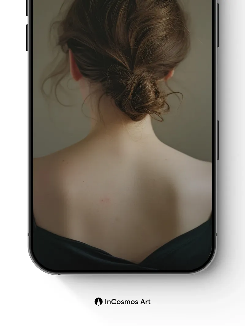 Did you know the human spine holds over 30 million nerve endings, each whispering secrets as light crawls across bare skin? Here, a low bun of chestnut hair coils like a forgotten scroll, shadowed by soft dusk—its texture alive, almost breathing against the matte wall. You feel the silence not just in the space between shoulders, but in the way silk drapes, catching the last breath of daylight.
