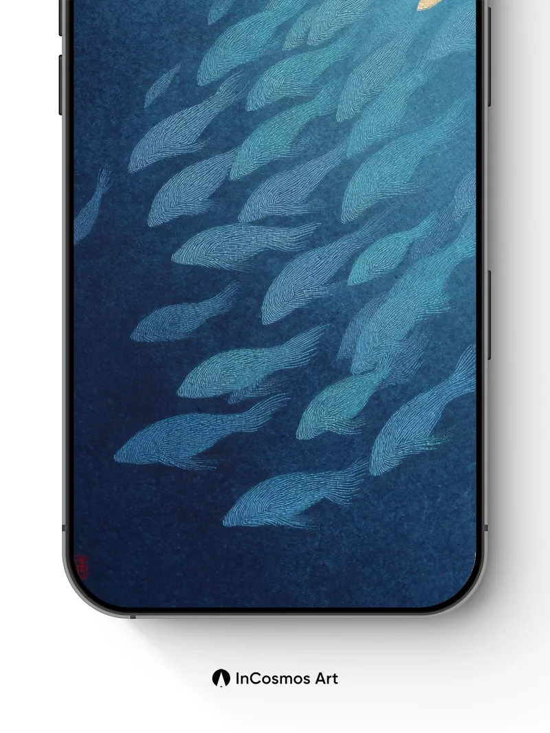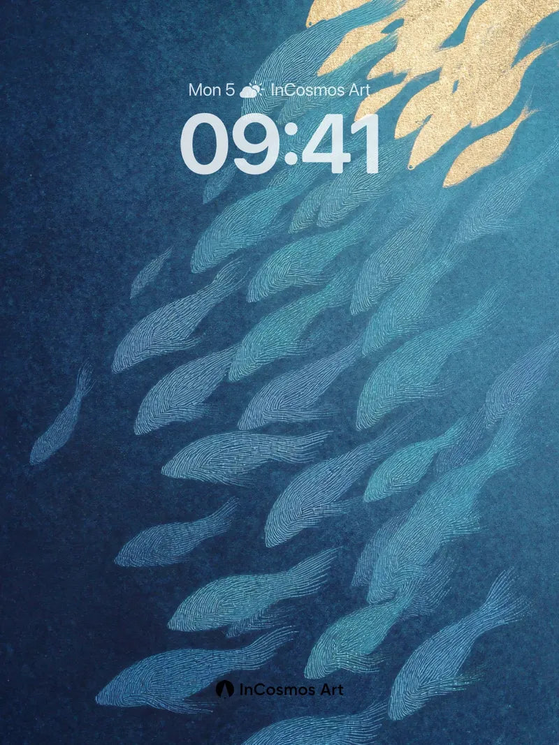 Debug page_description: Did you know that in traditional Japanese woodblock prints, gold leaf was used to represent divine light breaking through the ocean’s surface? Here, a school of fish glides upward like living ink, their bodies etched in fine lines that shimmer beneath a cascade of luminous gold. The deep indigo water breathes slowly, each stroke a whisper of movement frozen in time. Share this with your best friend. Send this to your love and swap a matching set. What if every swim toward the light left a trail of memory?