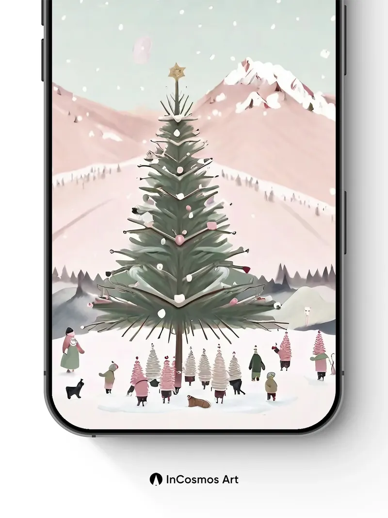 Debug product.metafields.custom.desc: Did you know snowflakes form unique hexagonal crystals as they descend through freezing air, each one a tiny, fleeting sculpture? Here, the quiet weight of winter settles over a forested valley where a grand pine stands crowned in gold, its branches heavy with soft white flakes and scattered pink ornaments. Below, villagers in warm coats gather like tiny figures in a living diorama, their breath curling into the cold, while a lone dog watches the sky. The mountains behind rise in pale rose hues, their peaks dusted with snow that glows under a hushed twilight.