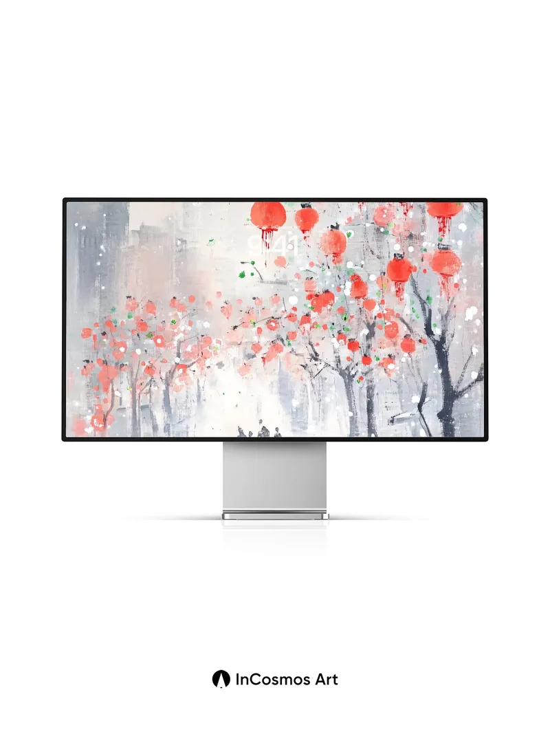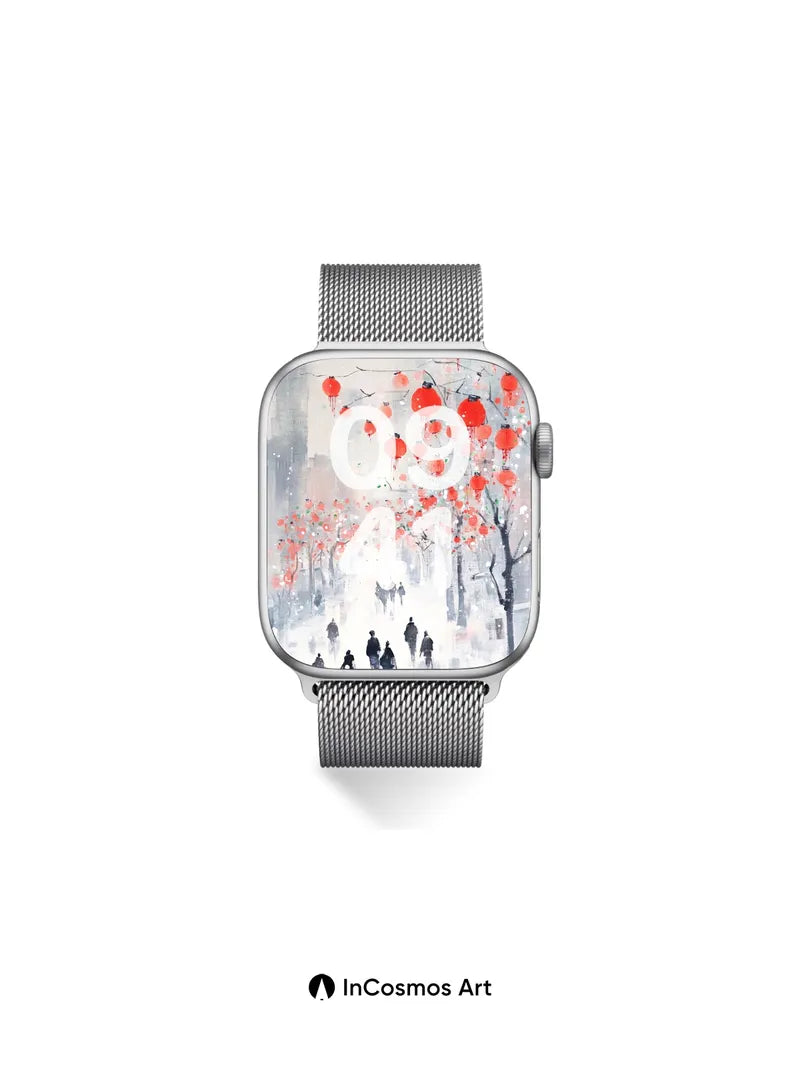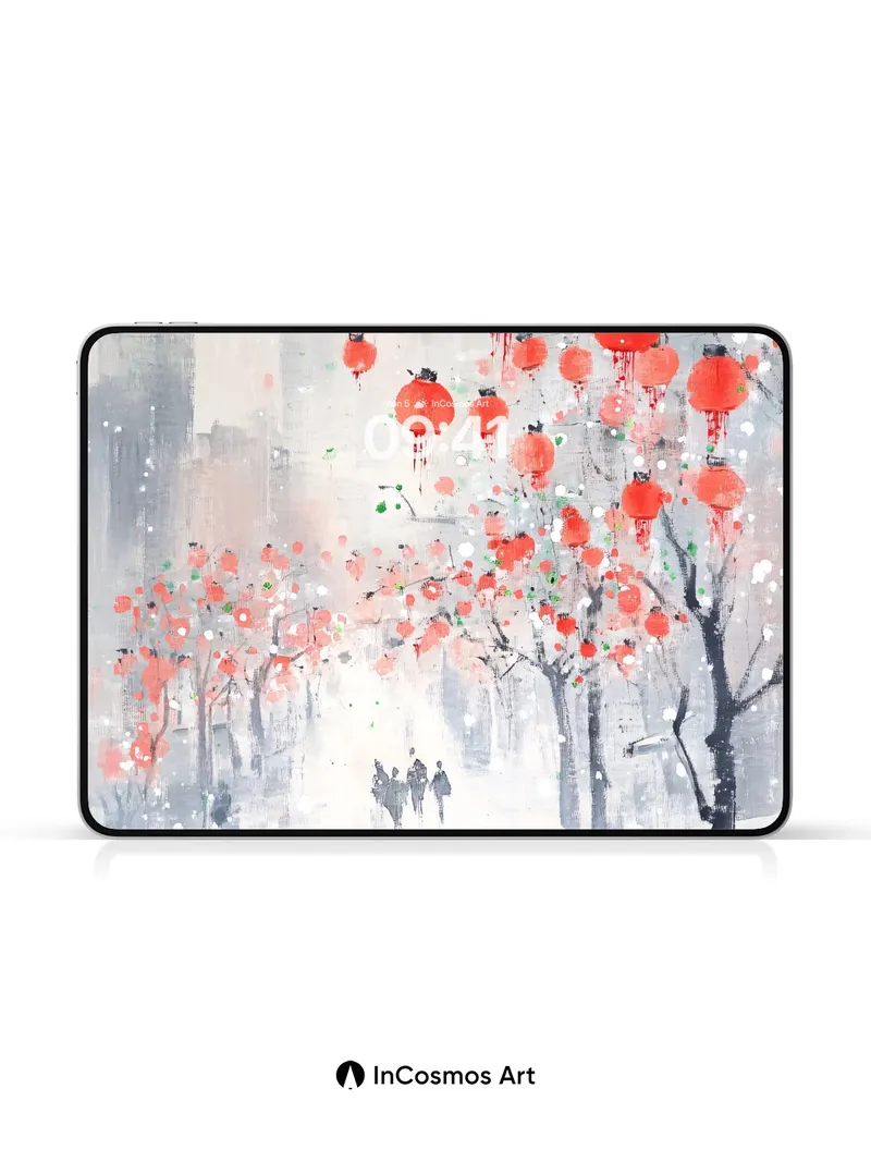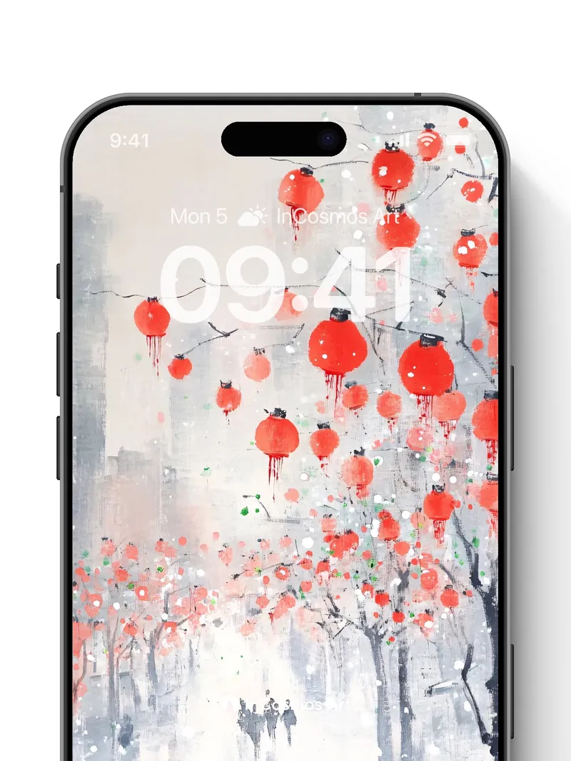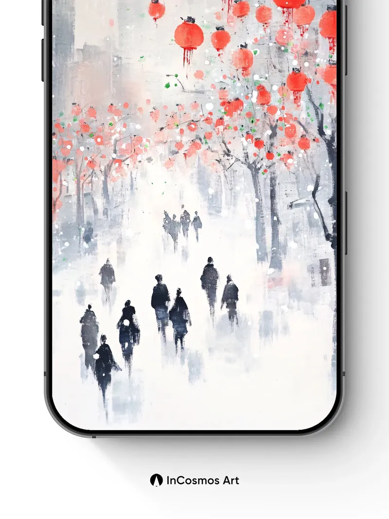 Debug product.metafields.custom.desc: Did you know that in ancient China, red lanterns were hung to ward off evil spirits during winter festivals? Here, they hang like glowing embers above a snow-drenched avenue, their crimson warmth bleeding into the pale mist as bare branches cradle falling flakes. The people below are silhouettes—quiet travelers in a world where light breathes through paper and frost clings to every edge.