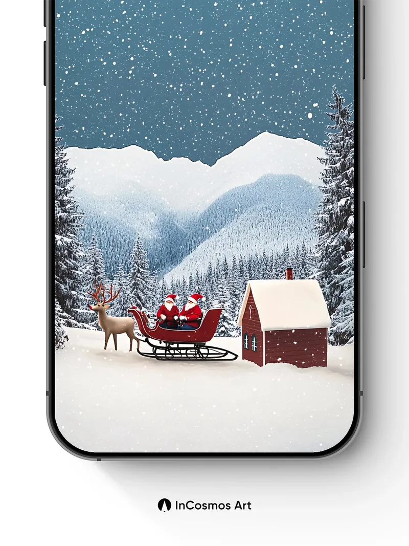 Debug page_description: Did you know snowflakes form unique hexagonal patterns as they fall through freezing air, each one a fleeting masterpiece? In this still moment, light crawls over the icy peaks and settles like velvet on the red sleigh, where two Santas rest beneath a sky that breathes stars into existence. The reindeer stands silent, hooves sunk in powder, while the little cabin glows with warmth against the vast cold. Share this with your best friend. Send this to your love and swap a matching set. What if every snowflake carried a wish from a different world?