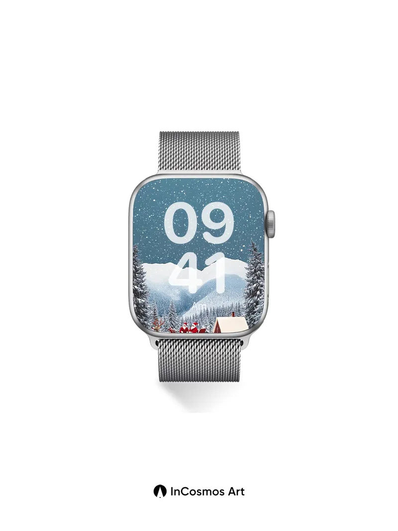 Debug product.metafields.custom.desc: Did you know snowflakes form unique hexagonal patterns as they fall through freezing air, each one a fleeting masterpiece? In this still moment, light crawls over the icy peaks and settles like velvet on the red sleigh, where two Santas rest beneath a sky that breathes stars into existence. The reindeer stands silent, hooves sunk in powder, while the little cabin glows with warmth against the vast cold.