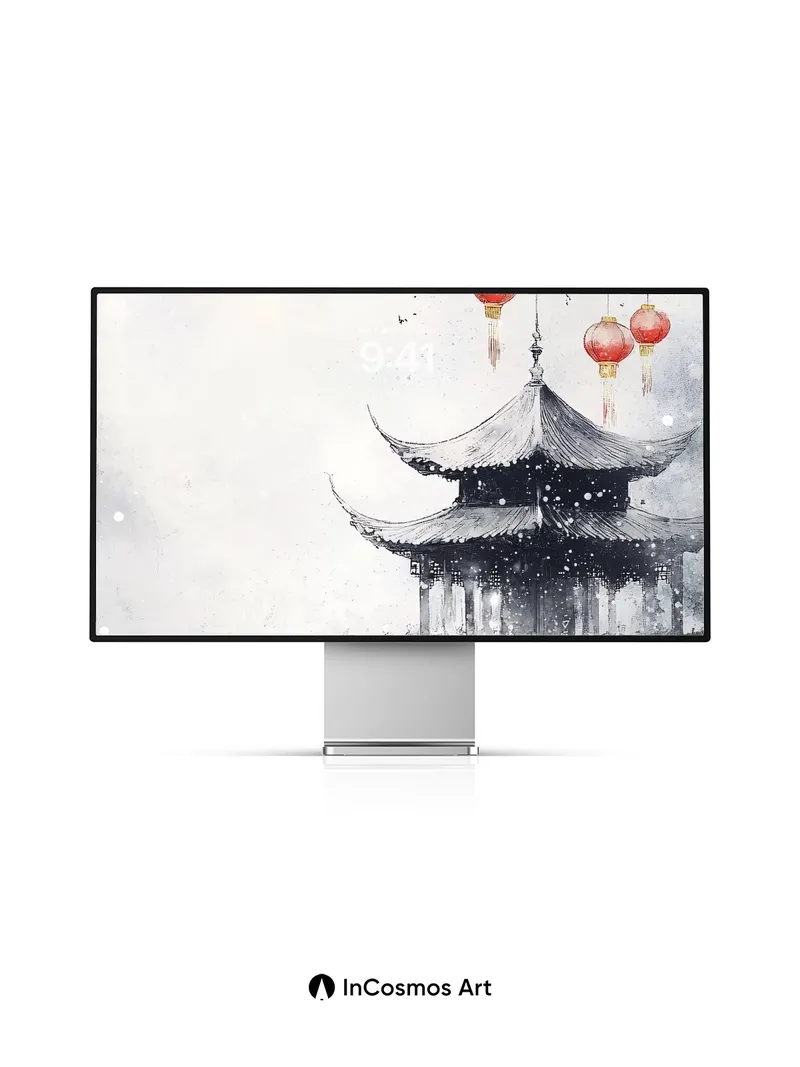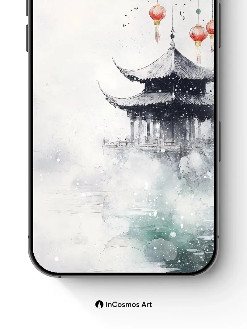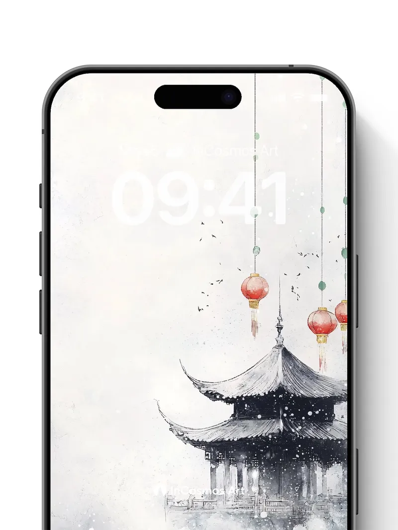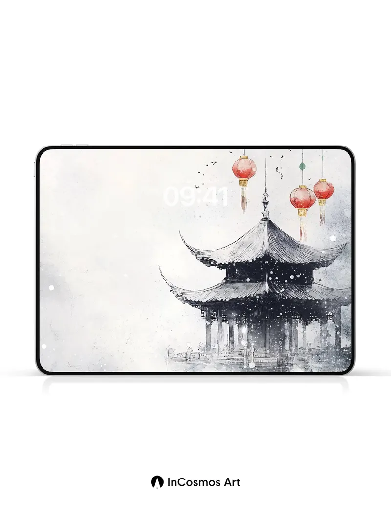Snowfall Serenity Wallpaper with Hanging Lanterns