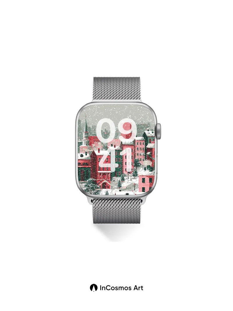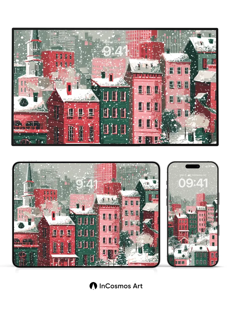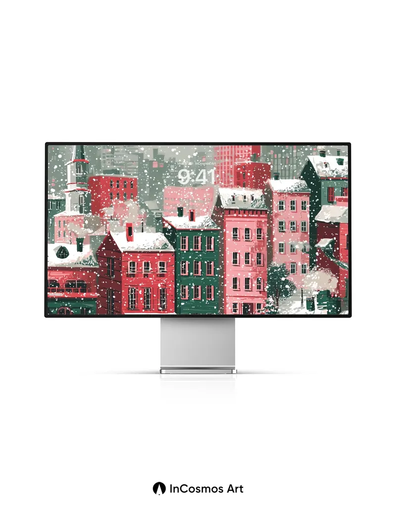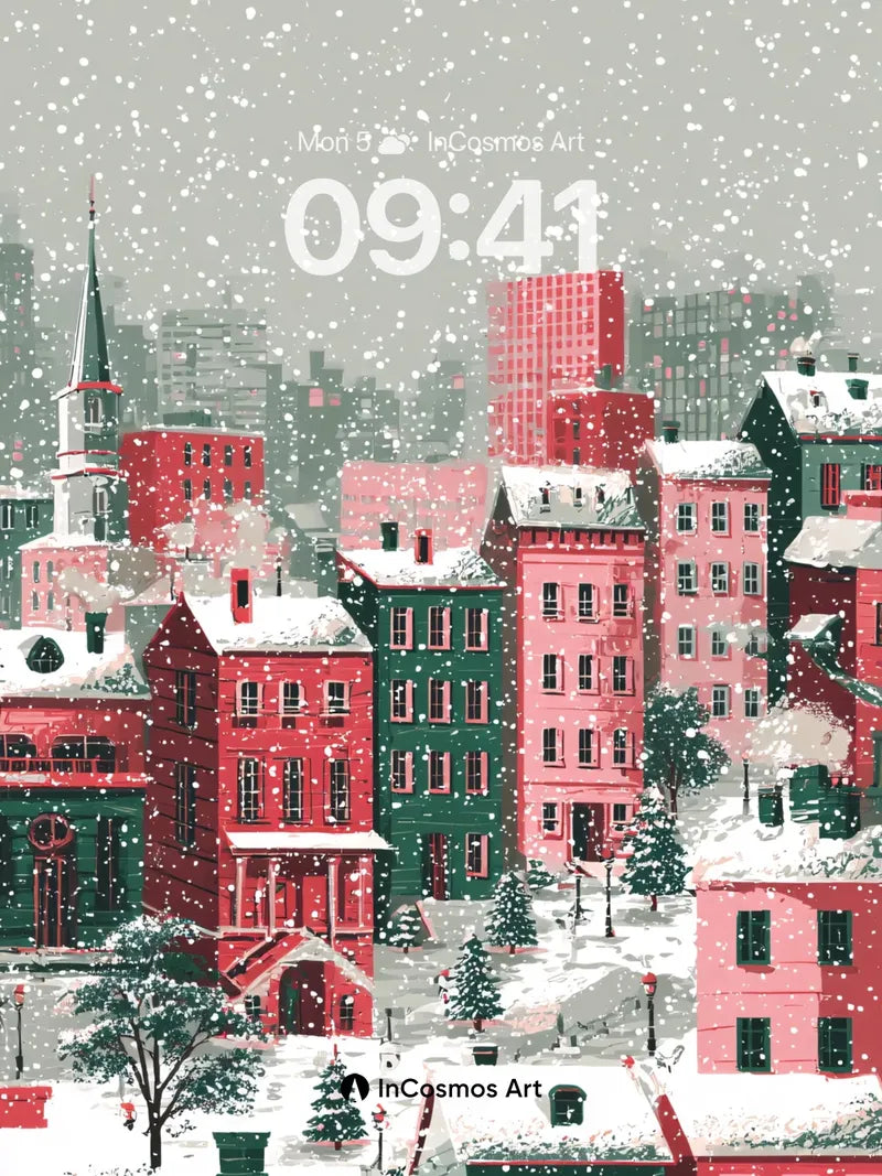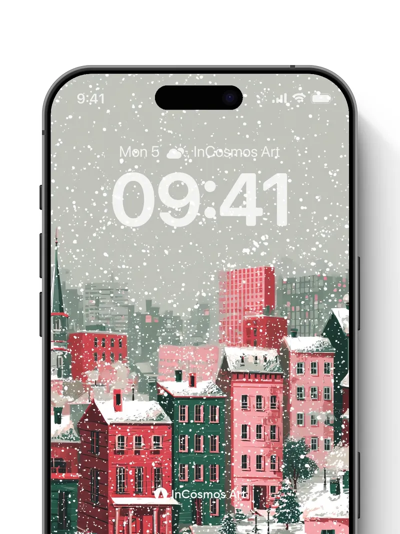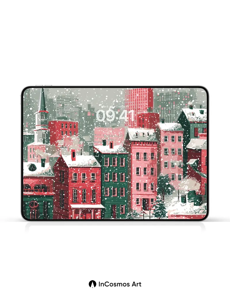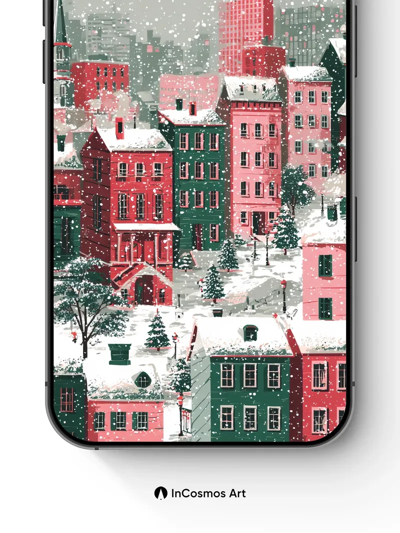 Snowfall Whispers Wallpaper with Crimson Rooftops