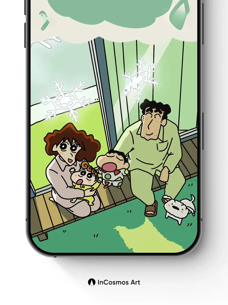 Debug product.metafields.custom.desc: Did you know that snowflakes form unique patterns in just 15 minutes, each one a fleeting masterpiece? In this scene, soft green light spills through glass panes as tiny flakes drift like frozen dreams, illuminating a family nestled on wooden steps—eyes wide, breath held, wrapped in quiet joy. The father’s calm gaze meets the child’s open-mouthed wonder, while the mother cradles her baby close, all under a cloud-shaped thought bubble that hums with unspoken warmth.