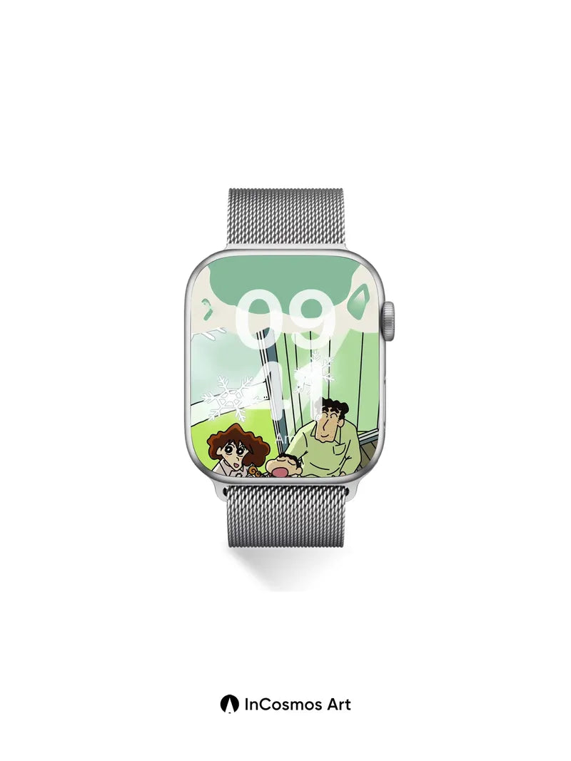 Debug page_description: Did you know that snowflakes form unique patterns in just 15 minutes, each one a fleeting masterpiece? In this scene, soft green light spills through glass panes as tiny flakes drift like frozen dreams, illuminating a family nestled on wooden steps—eyes wide, breath held, wrapped in quiet joy. The father’s calm gaze meets the child’s open-mouthed wonder, while the mother cradles her baby close, all under a cloud-shaped thought bubble that hums with unspoken warmth. Share this with your best friend. Send this to your love and swap a matching set. What if every winter moment could be preserved in a single frame?