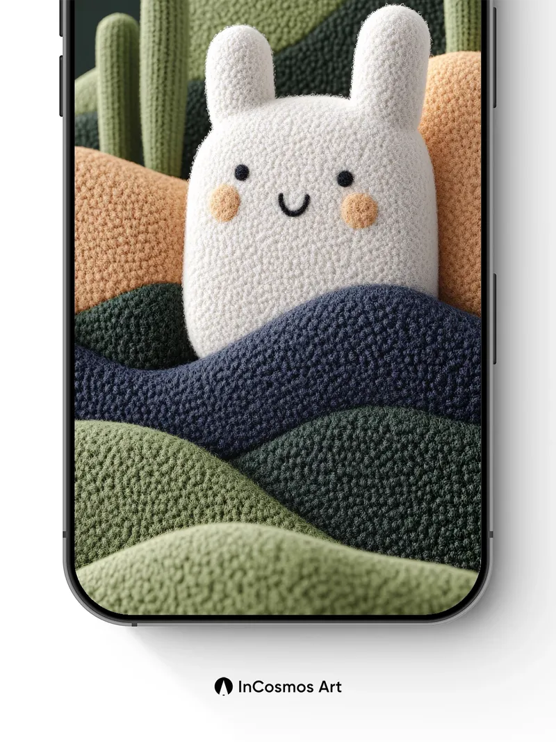 Did you know wool fibers can absorb up to 30% of their weight in moisture without feeling damp? Here, a plush white rabbit peeks through undulating hills of textured knit fabric, each ridge catching light like morning dew on moss. The cacti stand tall and silent, their green spines woven into the terrain like ancient sentinels. This world feels warm enough to touch, soft enough to sink into—where every fold breathes with quiet joy.