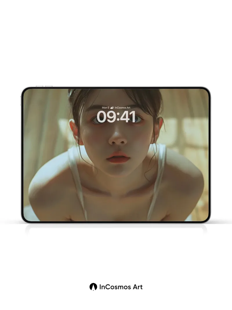 Debug product.metafields.custom.desc: Did you know the human eye can detect over one million colors, yet this moment feels like a single hue of quiet warmth? Sunlight spills across her skin like liquid silk, tracing the curve of her collarbone and pooling in the hollows of her shoulders, while shadows breathe softly beneath her arms. Her hair, coiled high in a loose knot, frames a face still in thought, eyes wide and unguarded, as if she’s just woken from a dream that didn’t end.