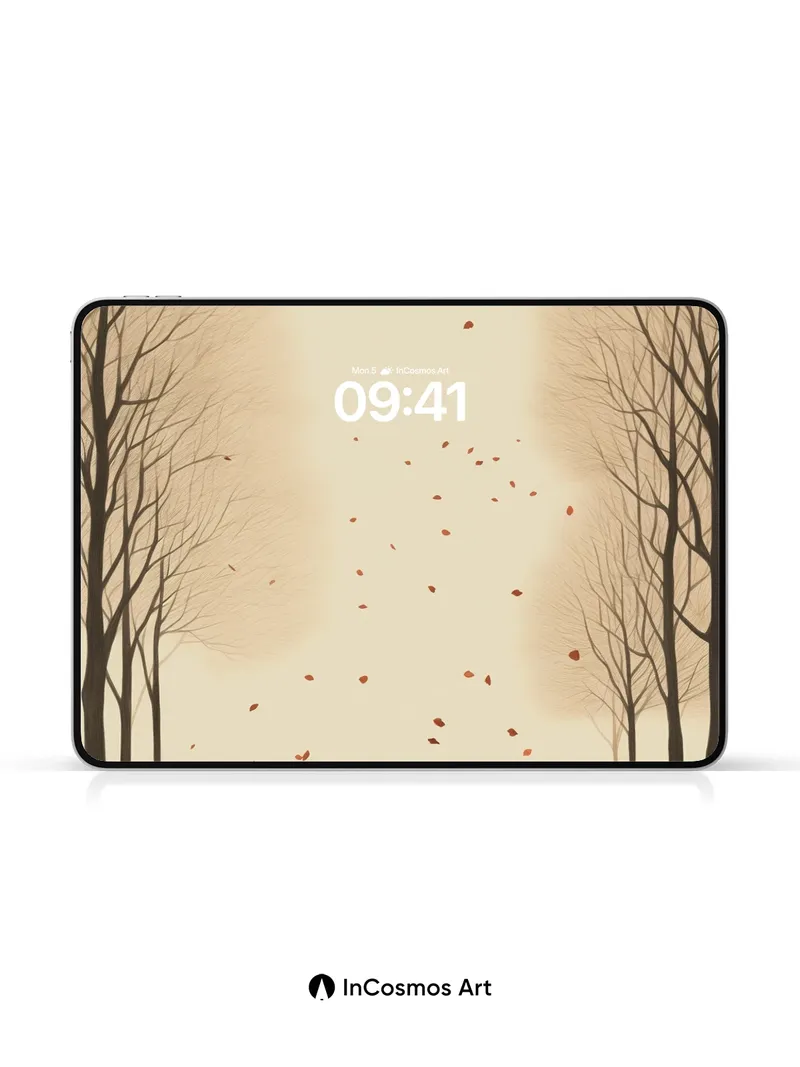 Solitary Autumn Walk Wallpaper with Falling Leaves