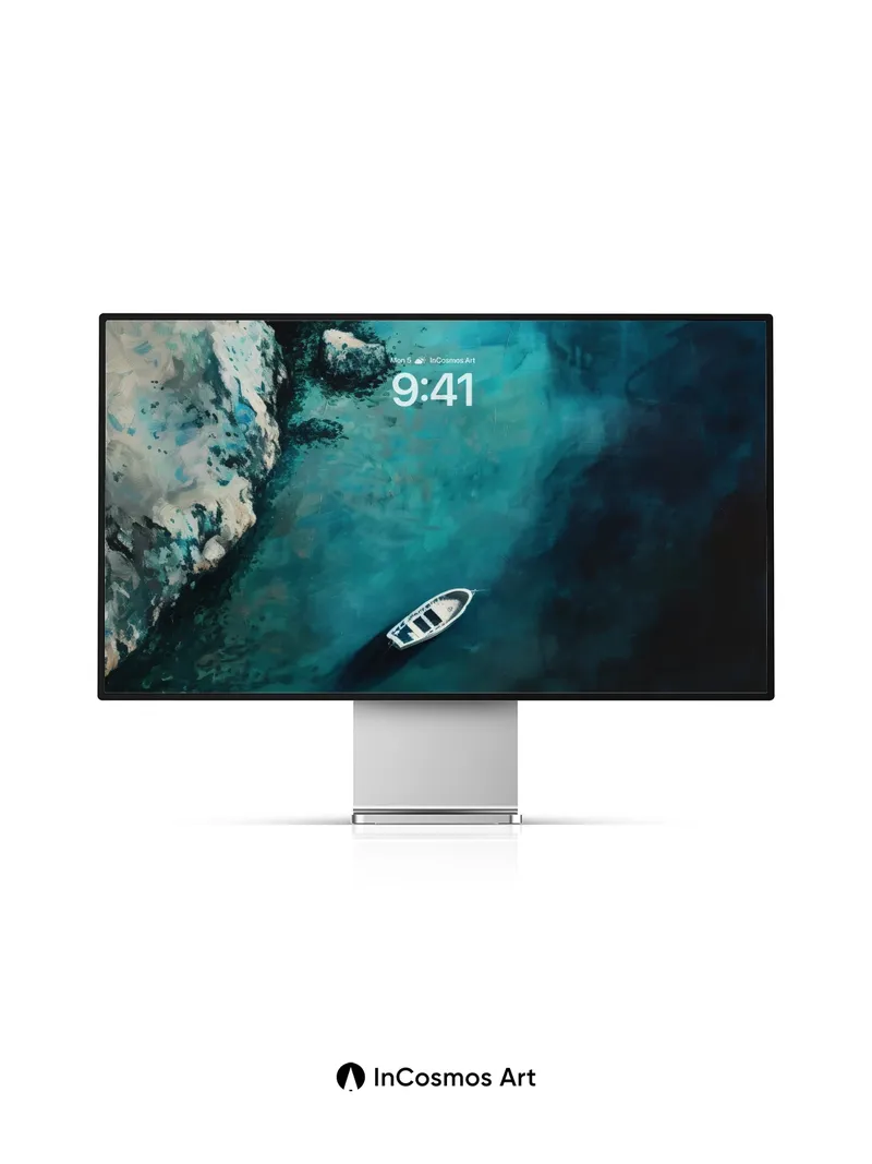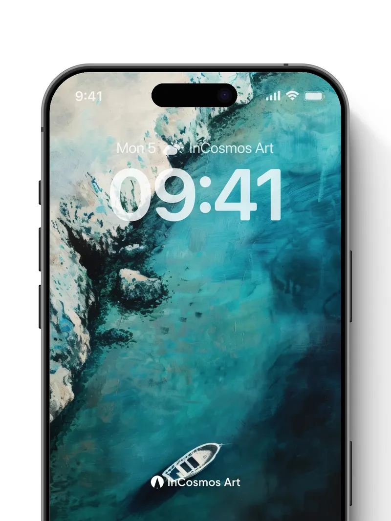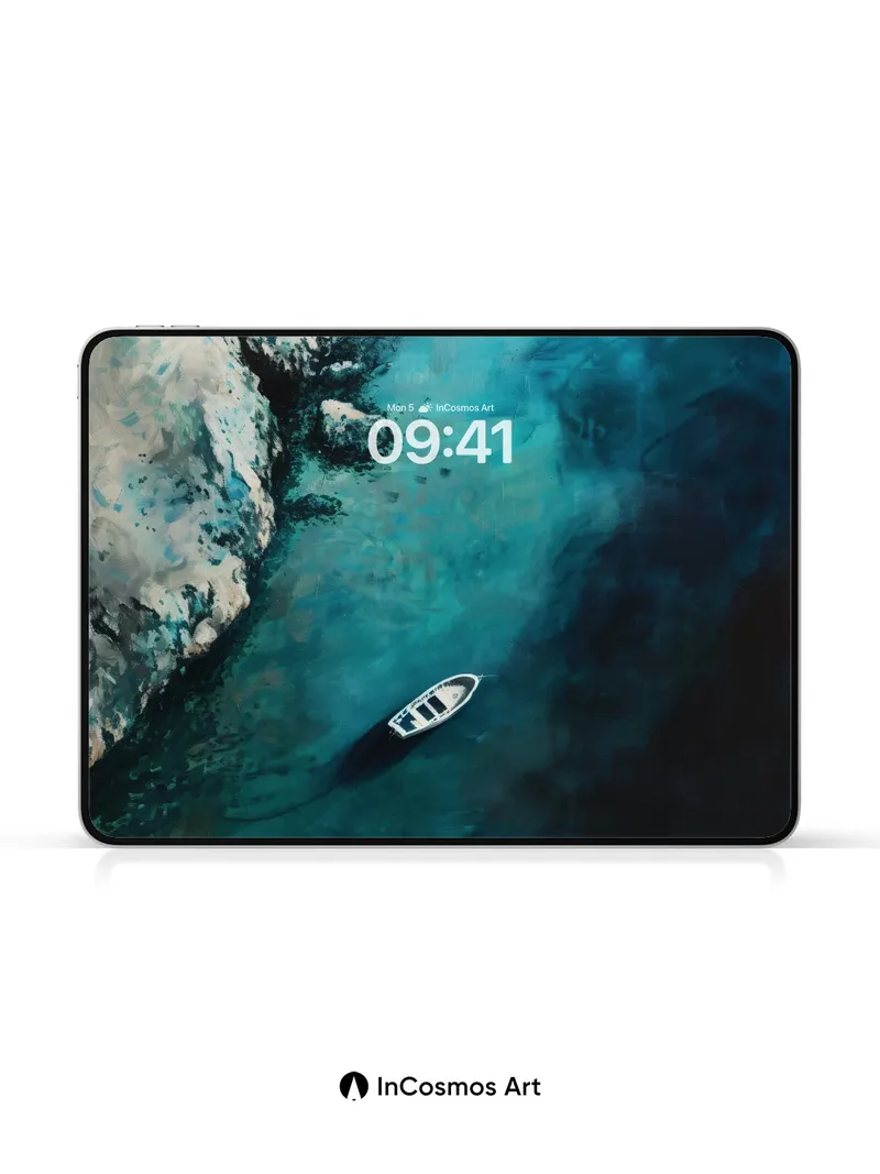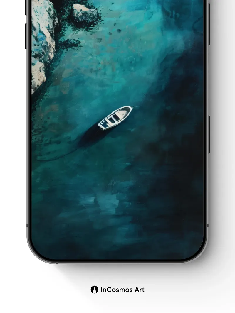 Debug product.metafields.custom.desc: Did you know the deep sea reflects light in ways that mimic oil on canvas? This scene captures a lone boat floating over an abyss of shifting turquoise, where color breathes through water like a slow pulse. The cliffside rises in textured layers, its pale stone etched by time and tide, while shadows coil beneath the surface as if the ocean itself is dreaming.