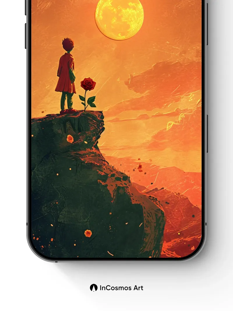 Debug product.metafields.custom.desc: Did you know the full moon casts a golden hue that can make shadows feel like they’re breathing? A lone figure stands on a jagged cliff, silhouetted against an amber sky where light crawls over rusted stone and petals float like embers. The rose beside them pulses with quiet defiance, its stem rooted in ancient rock beneath a sky that feels both infinite and intimate.