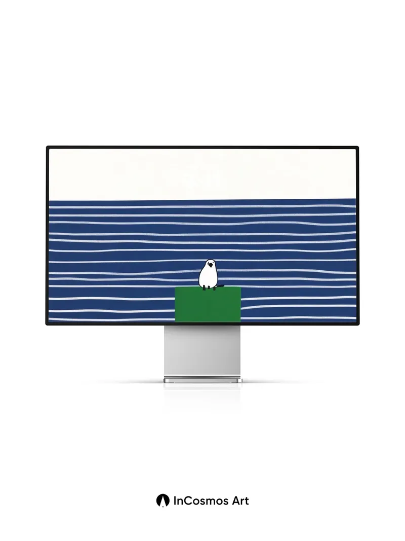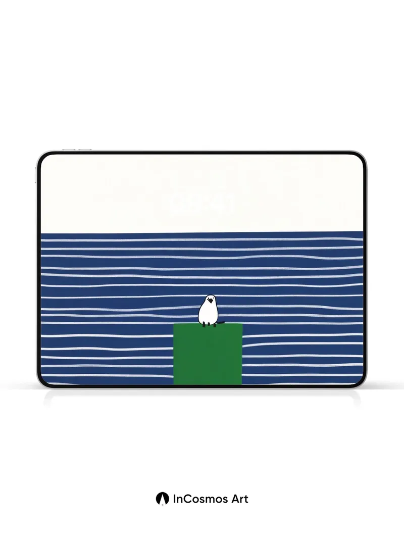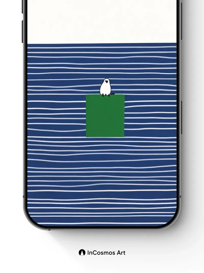 Debug page_description: Did you know that the Japanese art of *kintsugi* repairs broken ceramics with gold, celebrating imperfection as beauty? Here, a lone white bird perches on a green cube rising from endless wavy lines—like a quiet island in a sea of thought. The texture breathes: soft curves mimic water’s slow pulse, while the stark contrast between the calm sky and deep indigo waves evokes stillness beneath motion. Share this with your best friend. Send this to your love and swap a matching set. What if silence had a shape?