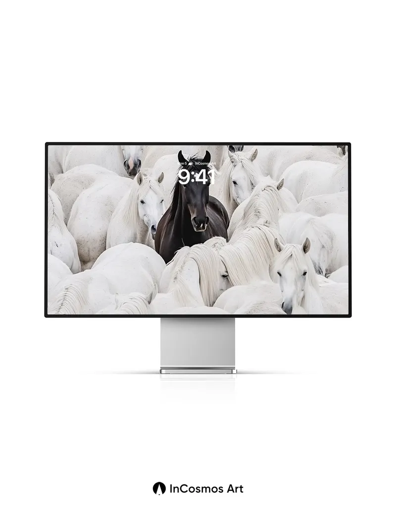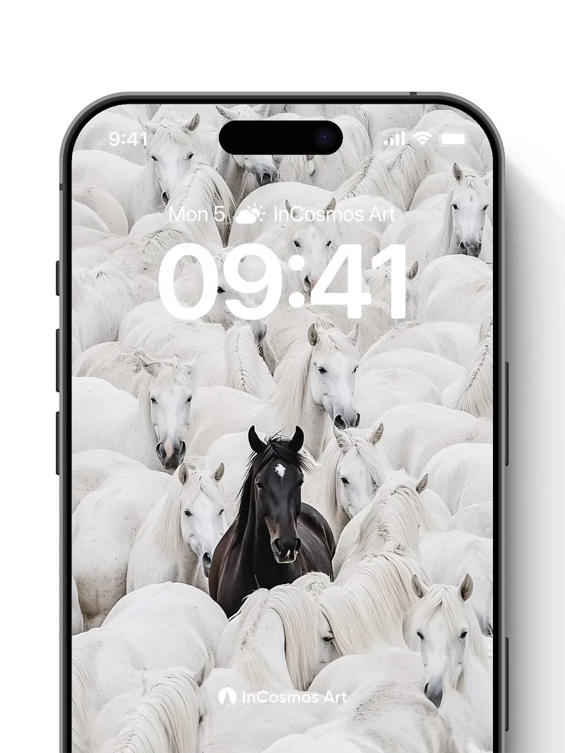 Debug product.metafields.custom.desc: Did you know that the Camargue horses of southern France are known for their ghostly white coats and wild spirit? Here, a single dark stallion stands like a silent storm in a sea of alabaster, its glossy coat absorbing the soft light while every surrounding horse glows with a pearlescent sheen. The air feels still, as if time has paused to witness this quiet rebellion of color and soul.
