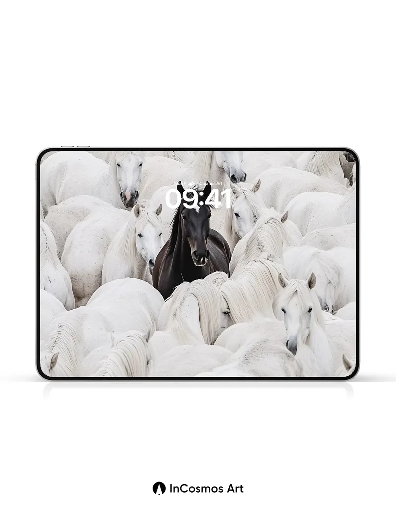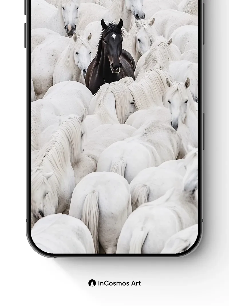 Debug page_description: Did you know that the Camargue horses of southern France are known for their ghostly white coats and wild spirit? Here, a single dark stallion stands like a silent storm in a sea of alabaster, its glossy coat absorbing the soft light while every surrounding horse glows with a pearlescent sheen. The air feels still, as if time has paused to witness this quiet rebellion of color and soul. Share this with your best friend. Send this to your love and swap a matching set. What would you whisper to the one who stands apart?