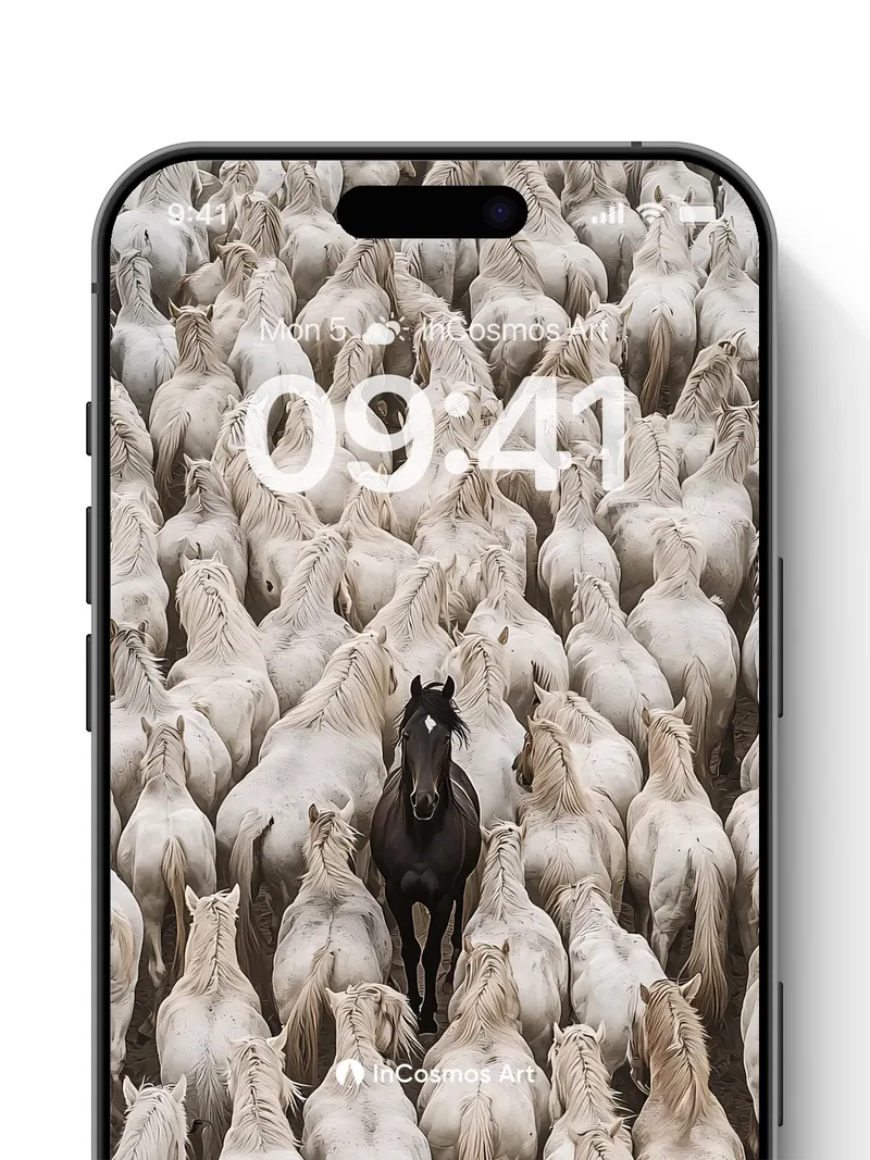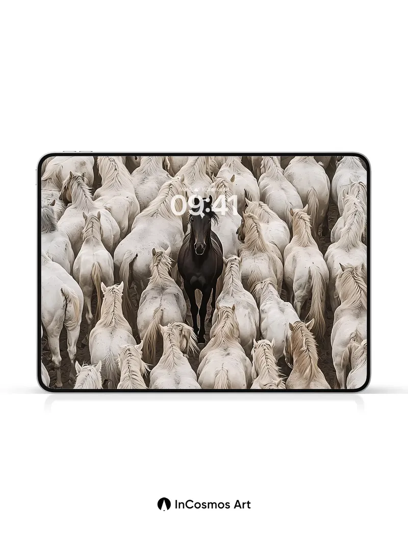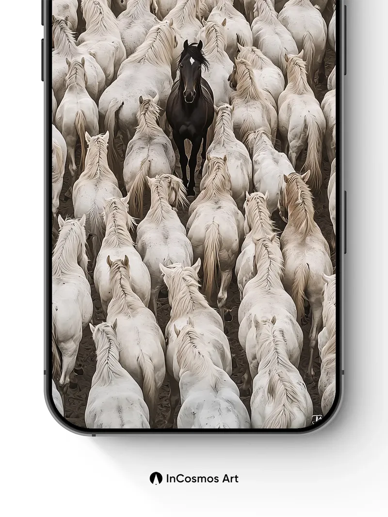 Debug page_description: Did you know that the Camargue horses of southern France are known for their ghostly white coats and wild spirit? Here, one dark horse stands alone in a sea of ivory, its coat like midnight silk against a storm of flowing manes. The light crawls over each spine, turning fur into liquid silver, while the black stallion breathes silence into the herd’s quiet rhythm. Share this with your best friend. Send this to your love and swap a matching set. What if solitude wasn't loneliness, but leadership?