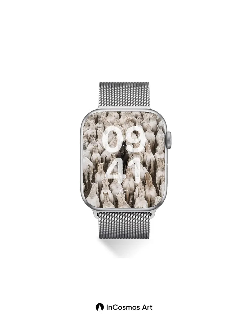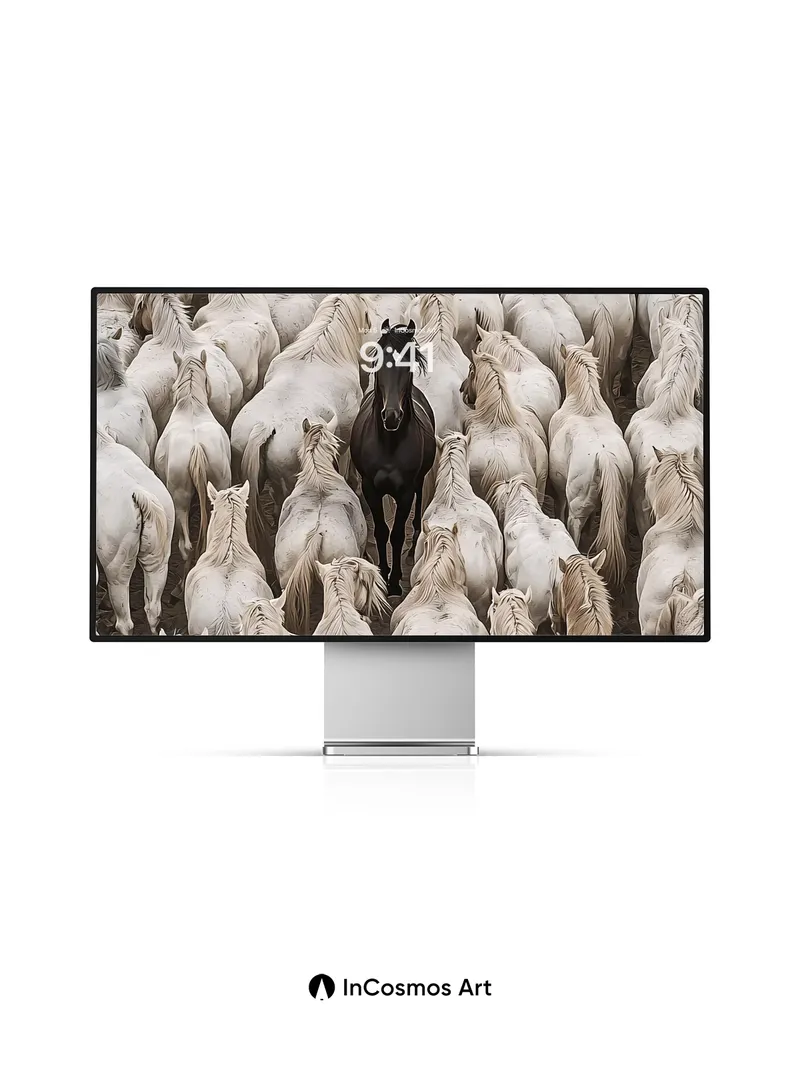 Debug product.metafields.custom.desc: Did you know that the Camargue horses of southern France are known for their ghostly white coats and wild spirit? Here, one dark horse stands alone in a sea of ivory, its coat like midnight silk against a storm of flowing manes. The light crawls over each spine, turning fur into liquid silver, while the black stallion breathes silence into the herd’s quiet rhythm.