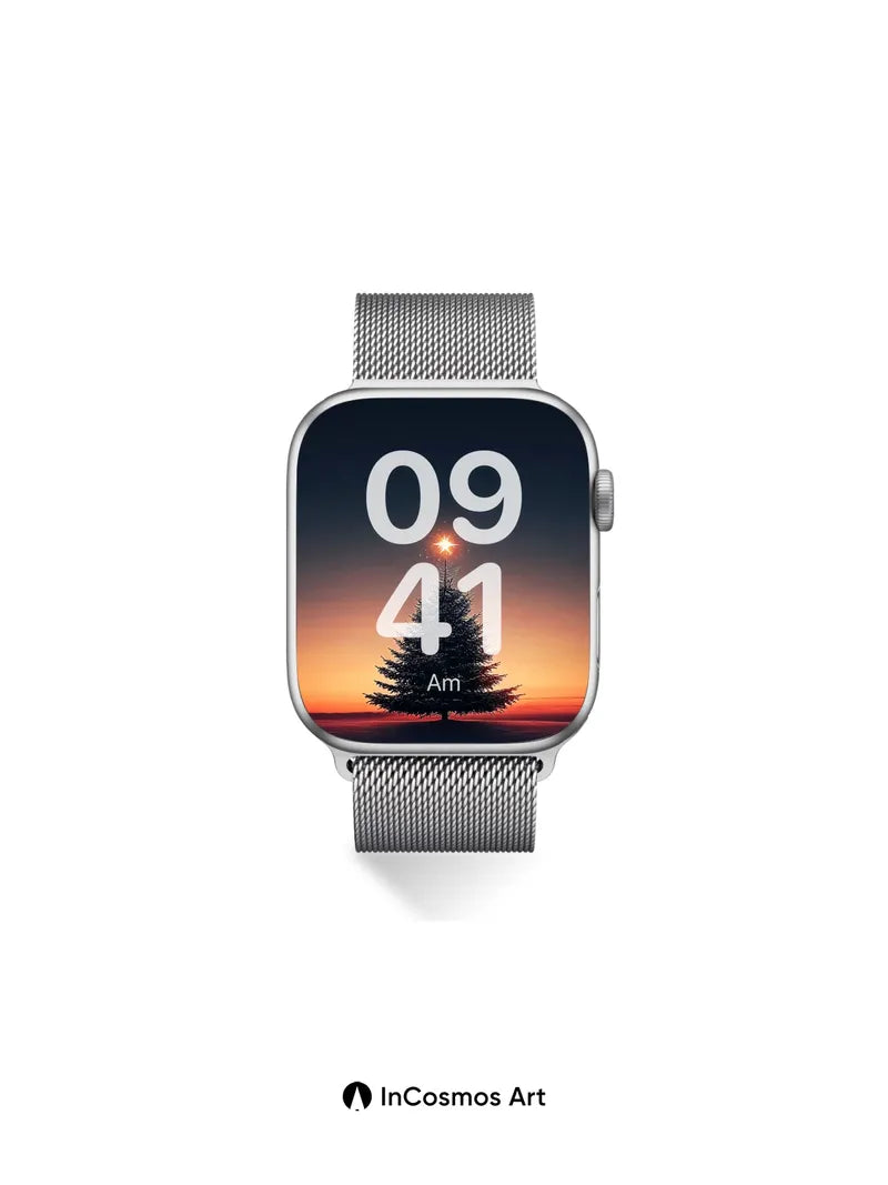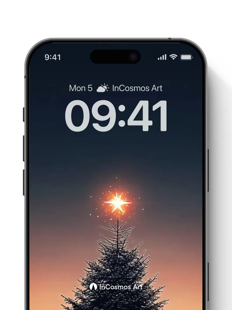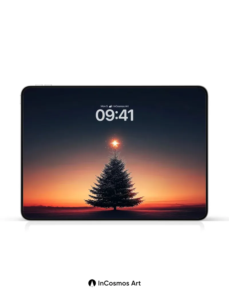 Debug product.metafields.custom.desc: Did you know the first Christmas tree in America was lit by candles in 1747? Here, a lone evergreen stands still beneath a radiant star that pulses like a heartbeat in the twilight sky, its branches dusted with frost that catches the fading light like scattered diamonds. The horizon bleeds into deep indigo and ember-orange, as if the earth itself is holding its breath under this celestial moment.