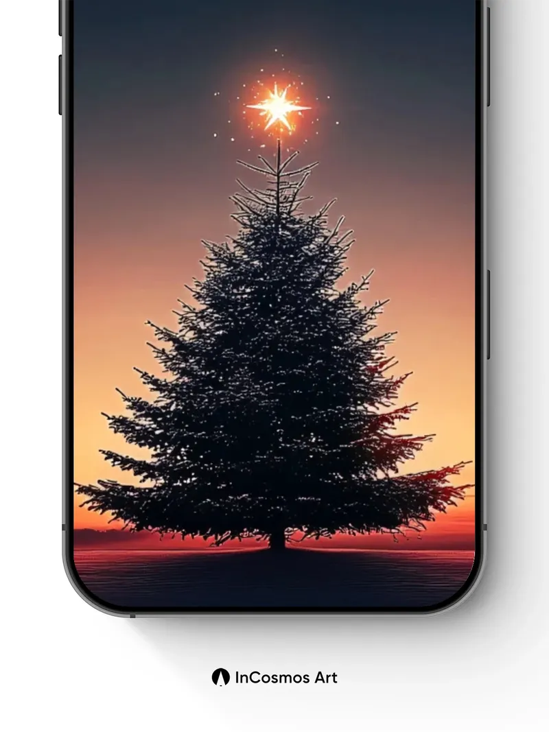 Debug page_description: Did you know the first Christmas tree in America was lit by candles in 1747? Here, a lone evergreen stands still beneath a radiant star that pulses like a heartbeat in the twilight sky, its branches dusted with frost that catches the fading light like scattered diamonds. The horizon bleeds into deep indigo and ember-orange, as if the earth itself is holding its breath under this celestial moment. Share this with your best friend. Send this to your love and swap a matching set. What would you whisper to the tree if it could speak?