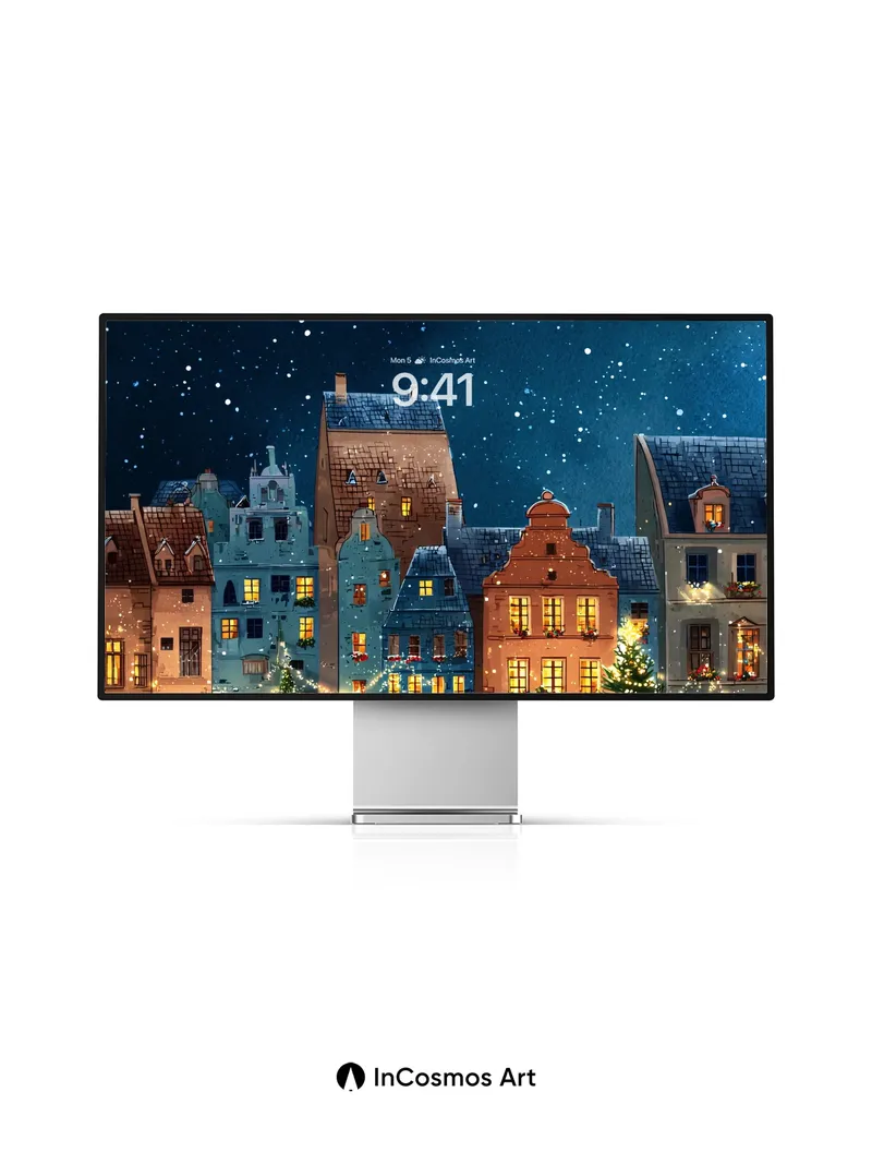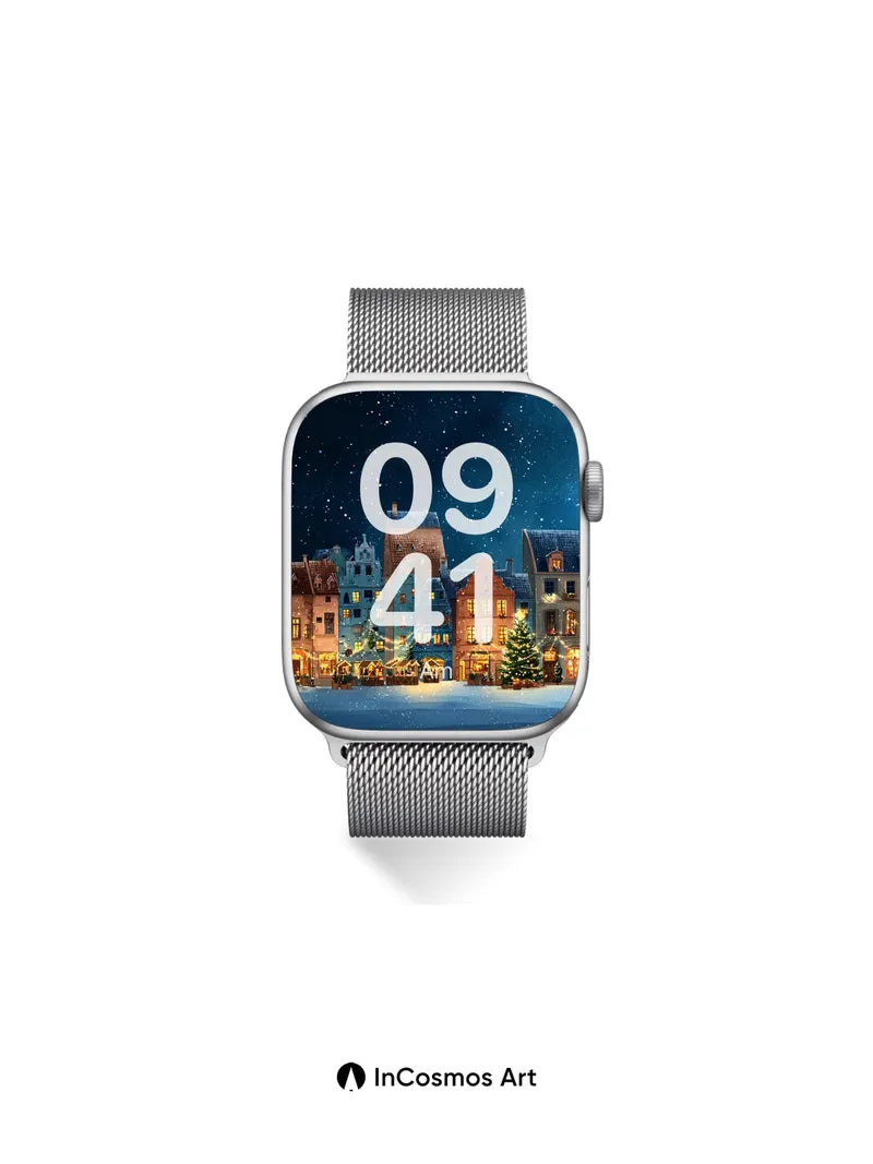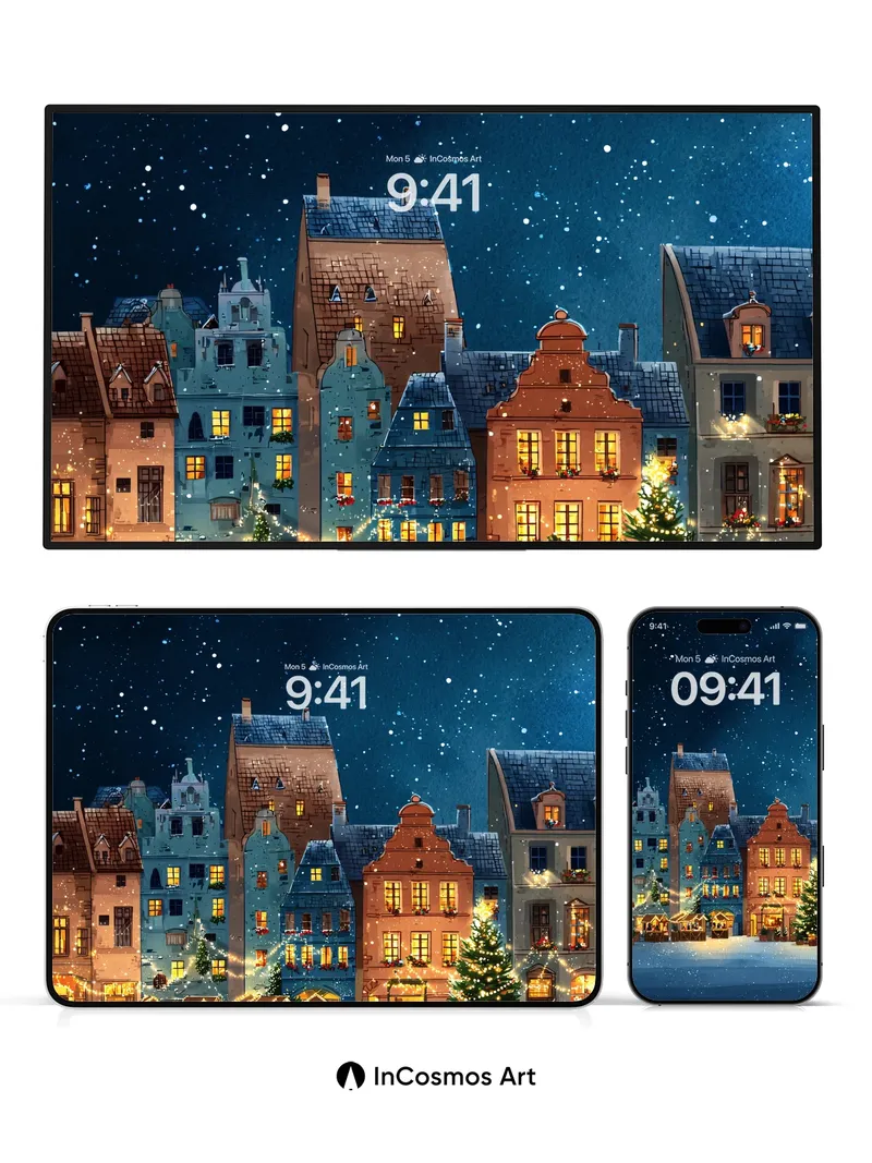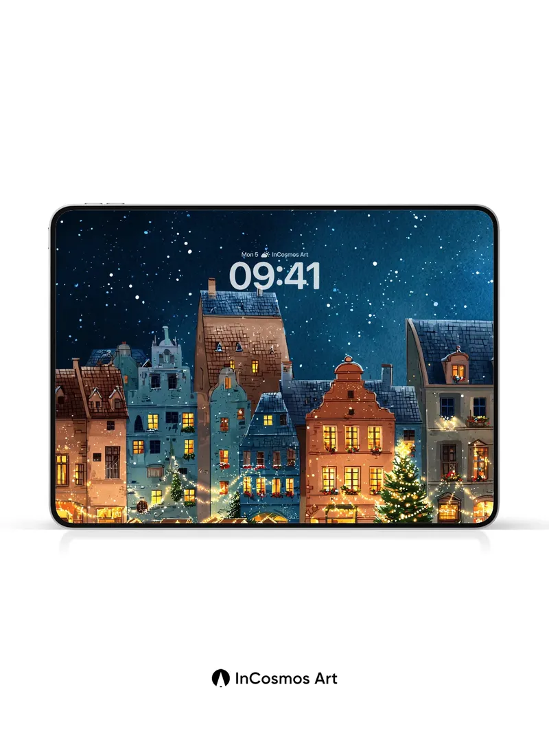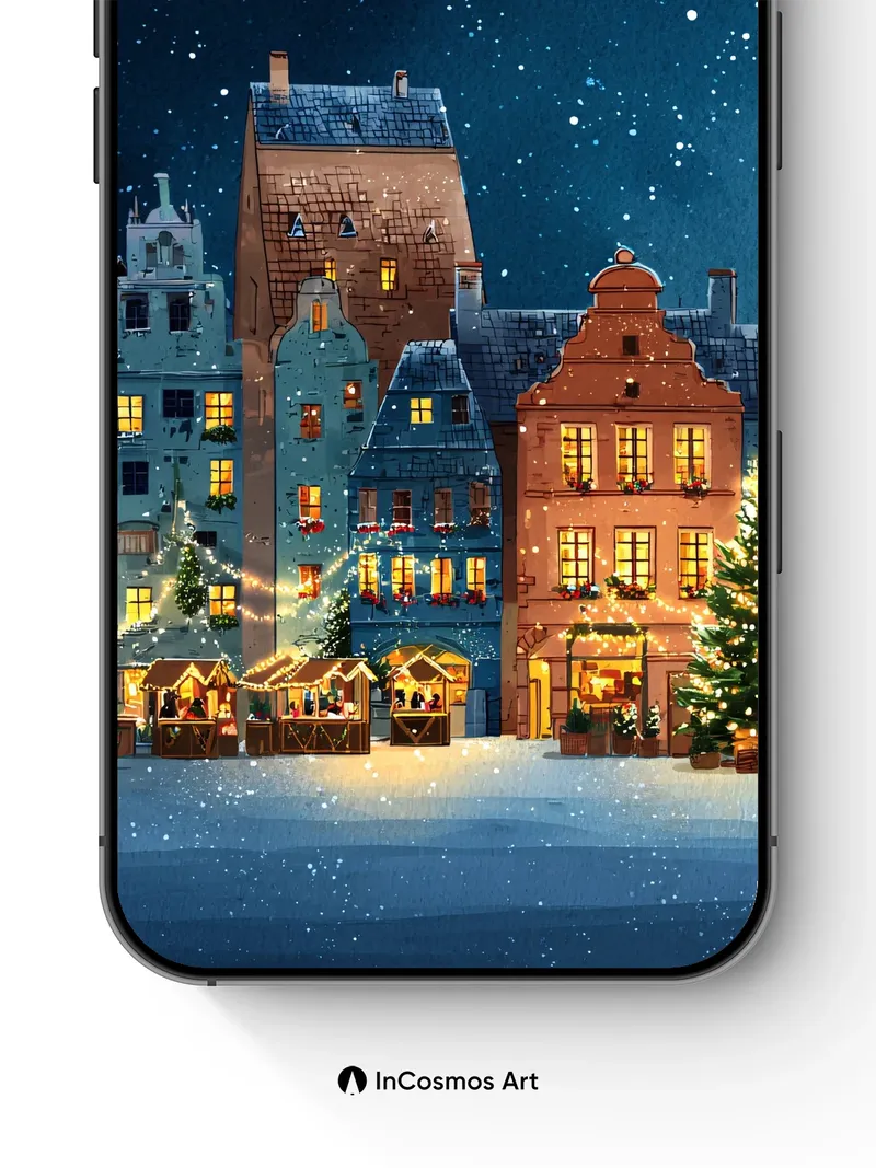 Debug product.metafields.custom.desc: Did you know the softest snowflakes fall at exactly 1.3 cm per second? Here, they drift like powdered stardust over cobblestone lanes where warm lantern light spills from timber-framed homes, each window a golden breath against the velvet dark. The air hums with quiet magic—Christmas trees stand sentinel, their lights trembling in the cold, while the sky above pulses with constellations that seem to blink in rhythm with your heartbeat.
