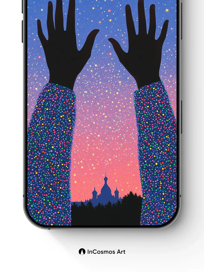 Did you know the night sky contains over 100 billion galaxies, each a universe of swirling light and silent stars? Your hands stretch into a galaxy-dusted twilight, fingers brushing constellations like forgotten promises. The sleeves shimmer with multicolored dots—tiny universes stitched into fabric—while below, a silhouette of domed spires rises from shadow, as if dreaming of escape.