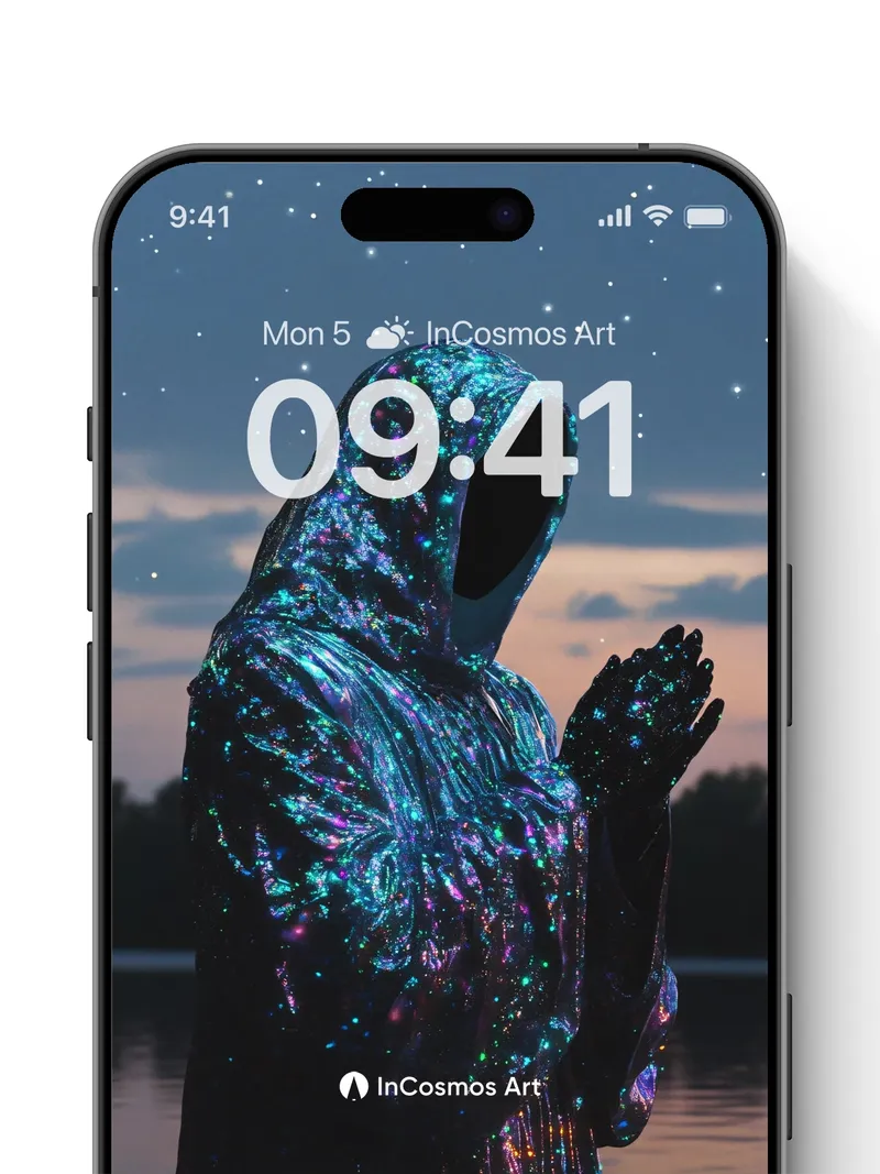 Debug page_description: Did you know that ancient astronomers once believed the stars were tiny holes in a celestial dome, letting through divine light? Here, that myth becomes flesh—a hooded figure draped in iridescent fabric that pulses like nebulae, its surface alive with shifting hues of teal, violet, and emerald, each thread a constellation stitched into reality. The water below mirrors not just the sky, but the soul’s reflection, as if the universe itself is praying. Share this with your best friend. Send this to your love and swap a matching set. What if every prayer left behind a trail of starlight?