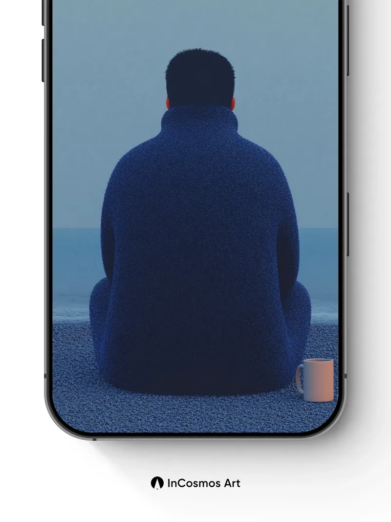 Debug page_description: Did you know the human eye can detect subtle shifts in texture even when motionless? Here, a deep navy knit coat breathes against a flat horizon where sky and sea dissolve into one seamless tone. The light doesn’t fall—it hovers, suspended like dust above a forgotten shore. A single ceramic mug rests beside the figure, its matte surface whispering warmth in contrast to the cool void. Share this with your best friend. Send this to your love and swap a matching set. What if silence had a color?
