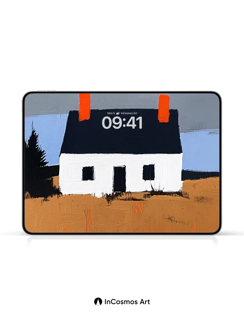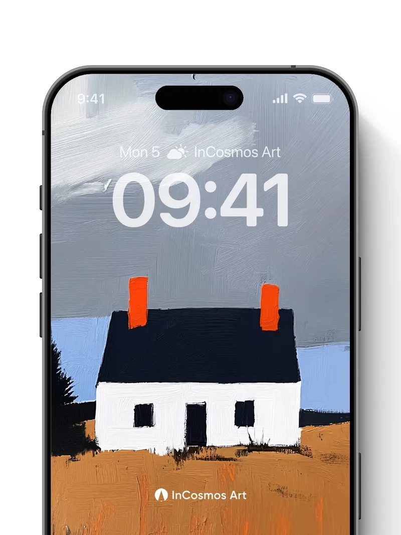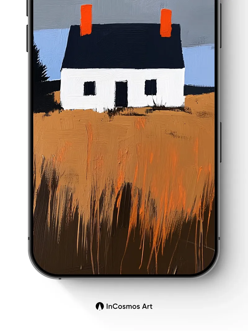 Did you know that the color rust has been used in ancient pigments since 2000 BCE, derived from iron oxide? This painting breathes through thick brushstrokes—golden grasses rise like flames beneath a sky of storm-gray and fleeting blue, while two orange chimneys pierce the silence like quiet warnings. The house stands alone, white and stark, as if time itself paused to admire its solitude.