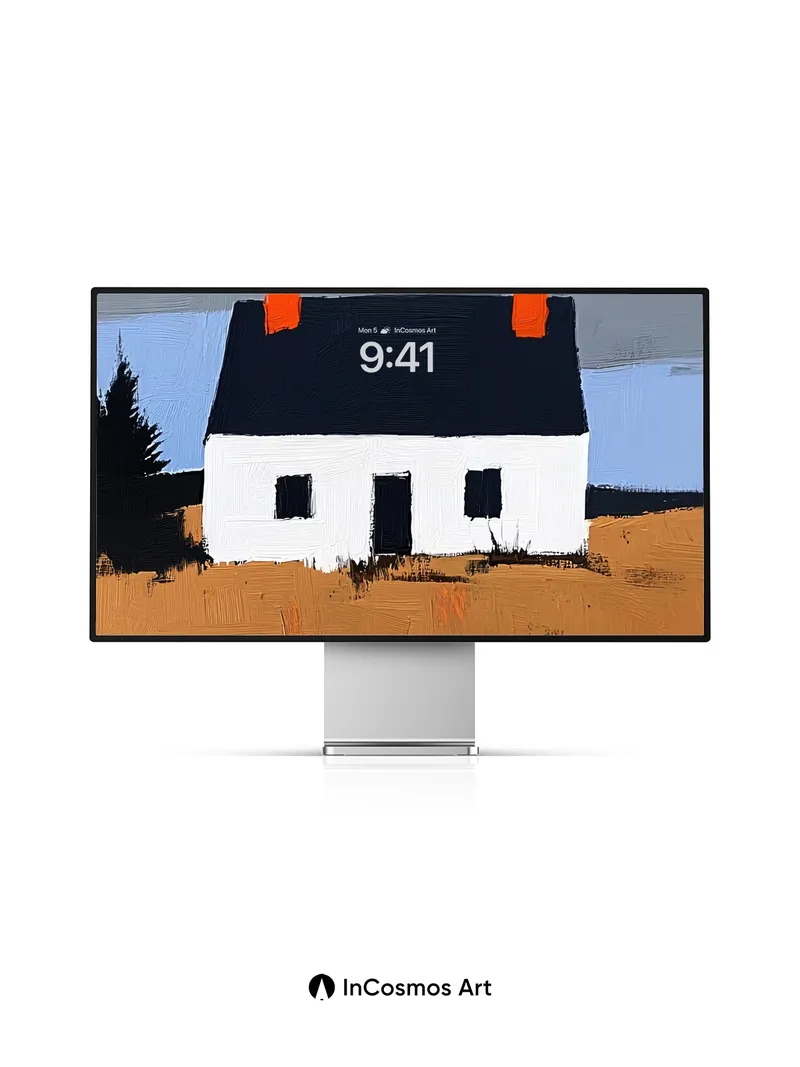 Debug product.metafields.custom.desc: Did you know that the color rust has been used in ancient pigments since 2000 BCE, derived from iron oxide? This painting breathes through thick brushstrokes—golden grasses rise like flames beneath a sky of storm-gray and fleeting blue, while two orange chimneys pierce the silence like quiet warnings. The house stands alone, white and stark, as if time itself paused to admire its solitude.