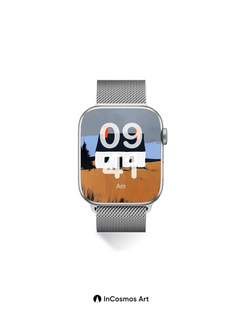 Debug page_description: Did you know that the color rust has been used in ancient pigments since 2000 BCE, derived from iron oxide? This painting breathes through thick brushstrokes—golden grasses rise like flames beneath a sky of storm-gray and fleeting blue, while two orange chimneys pierce the silence like quiet warnings. The house stands alone, white and stark, as if time itself paused to admire its solitude. Share this with your best friend. Send this to your love and swap a matching set. What if every field held a secret waiting to be seen?
