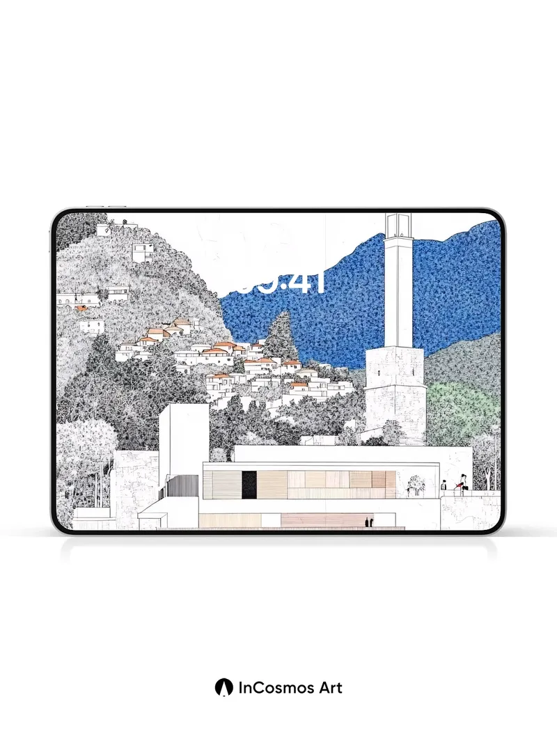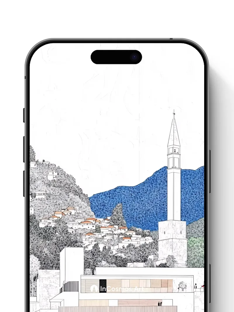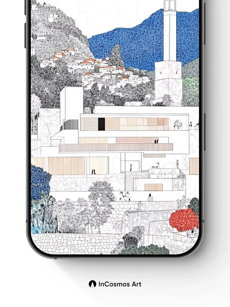 Debug product.metafields.custom.desc: Did you know that ancient stone walls in Mediterranean villages were built to absorb and slowly release heat, creating a natural climate balance? Here, the texture of weathered limestone breathes across terraces, while a slender minaret pierces the sky like a quiet prayer. The hillsides are stitched with homes and trees, each detail drawn in ink and colored with earth’s patience—blue mountains hushed behind, red leaves flickering in the breeze as if remembering fire.