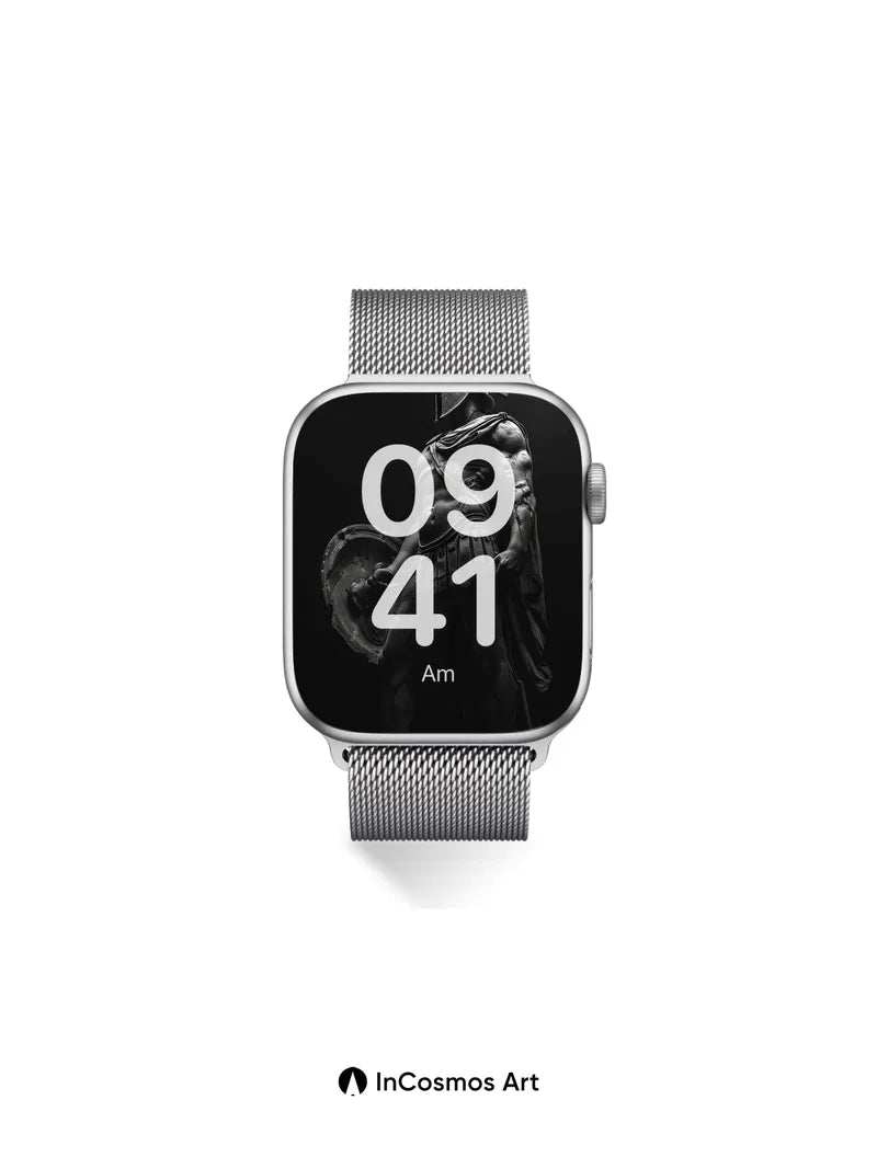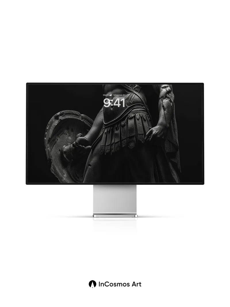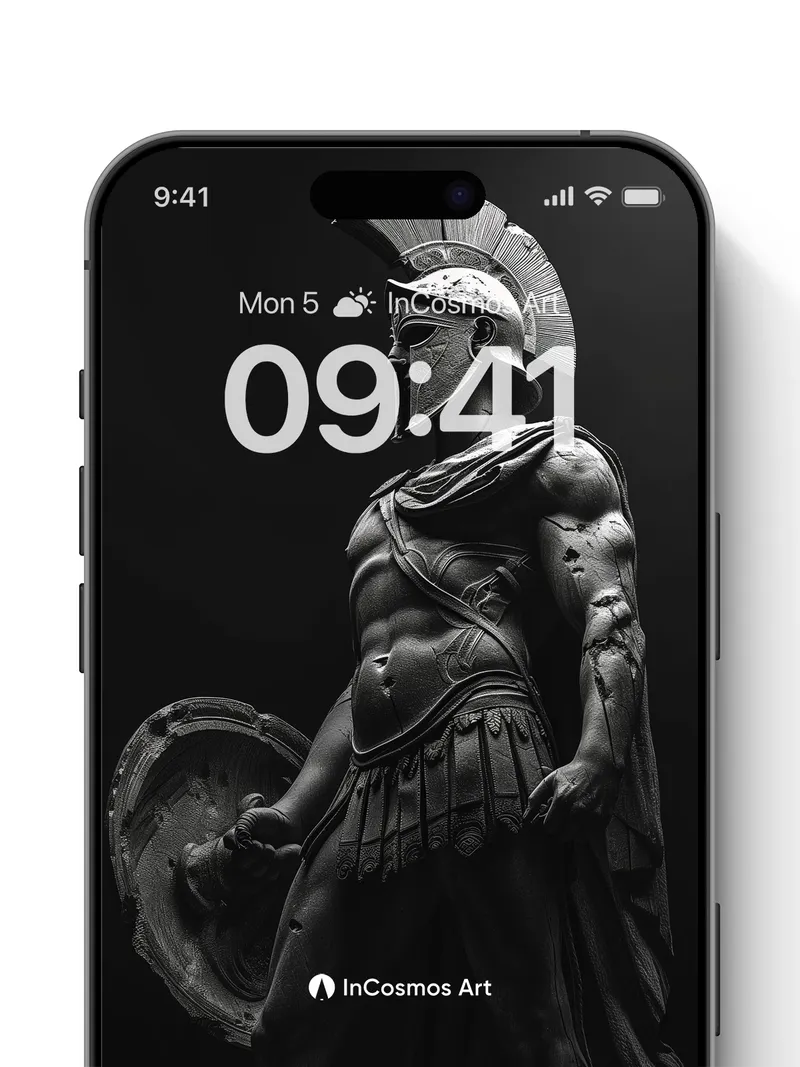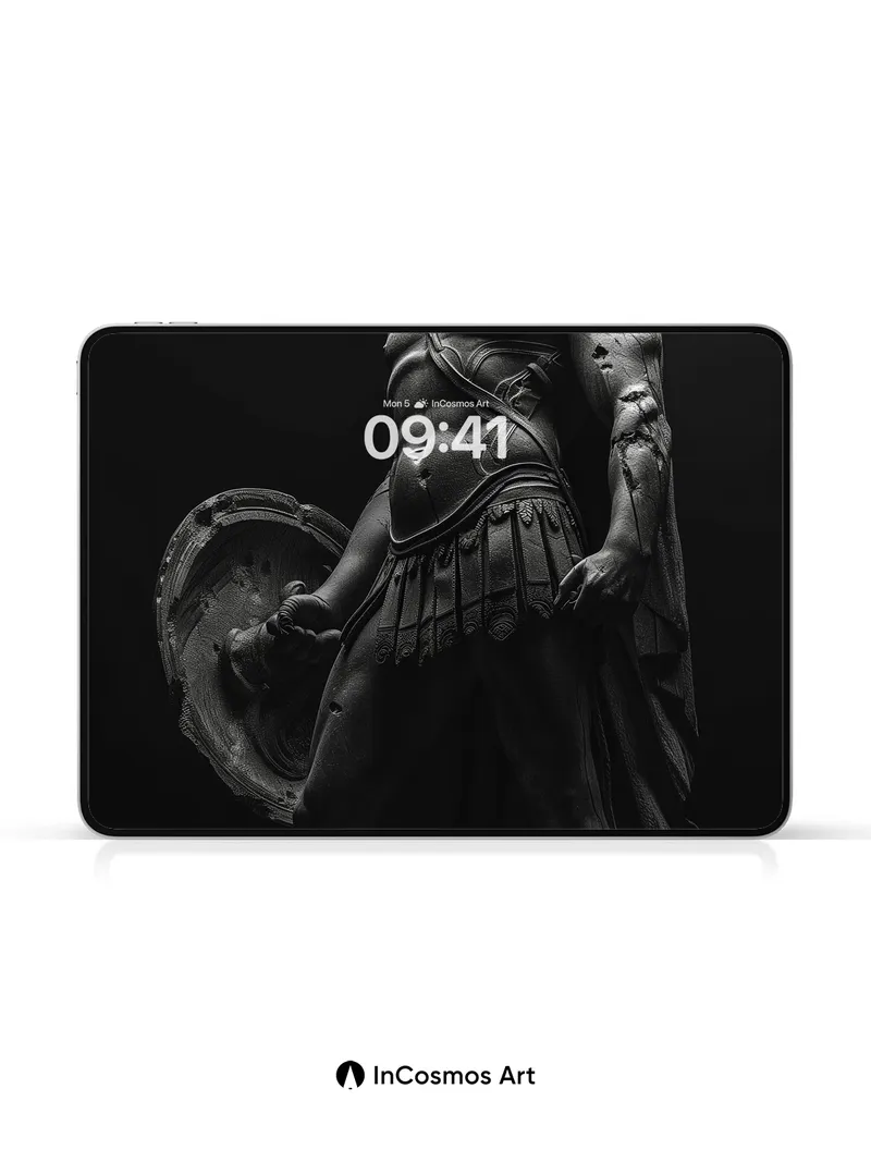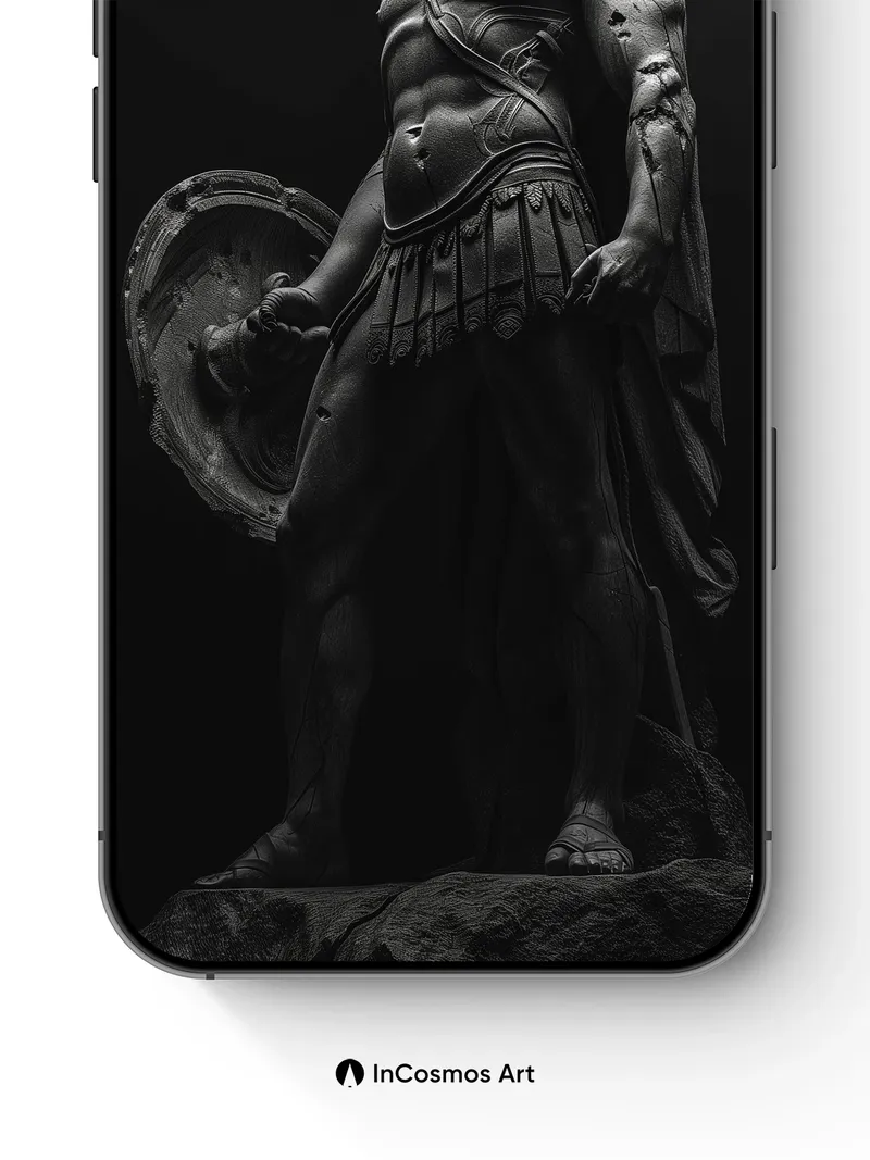 Debug page_description: Did you know ancient Greek sculptors used to carve warriors in motion to capture breath and tension? Here, light crawls over cold bronze armor like a slow memory, each ridge of muscle and crease in the tunic whispering of battles long forgotten. The helmet’s crest stands proud, a silent echo of command, while shadows pool around the feet as if the earth itself holds its breath. Share this with your best friend. Send this to your love and swap a matching set. What would you say to the warrior who guards your dreams?