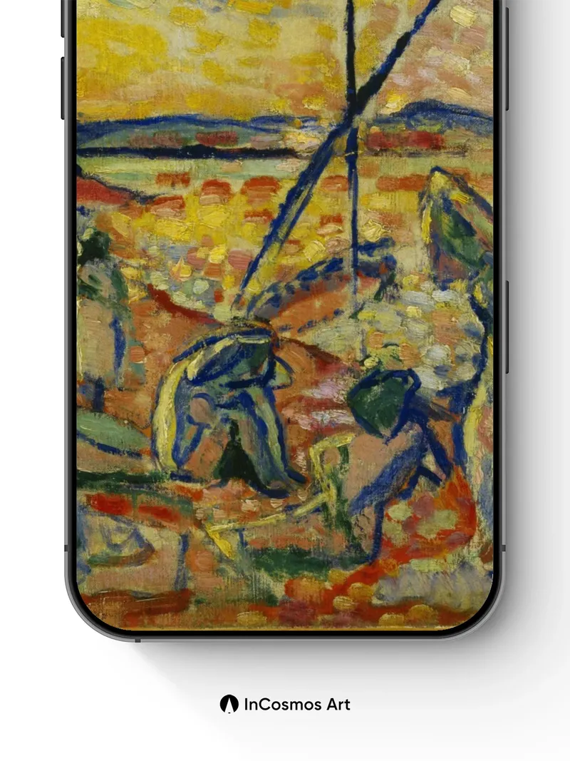 Did you know that Henri Matisse once said color was the key to emotional expression? Here, golden light bleeds across a sunbaked landscape where figures lounge beneath a trembling palm, their forms dissolved into bold strokes of ochre, cerulean, and jade. The brushwork hums like a warm breeze, each dot of pigment pulsing with life, as if the scene itself is breathing in rhythm with the heat.