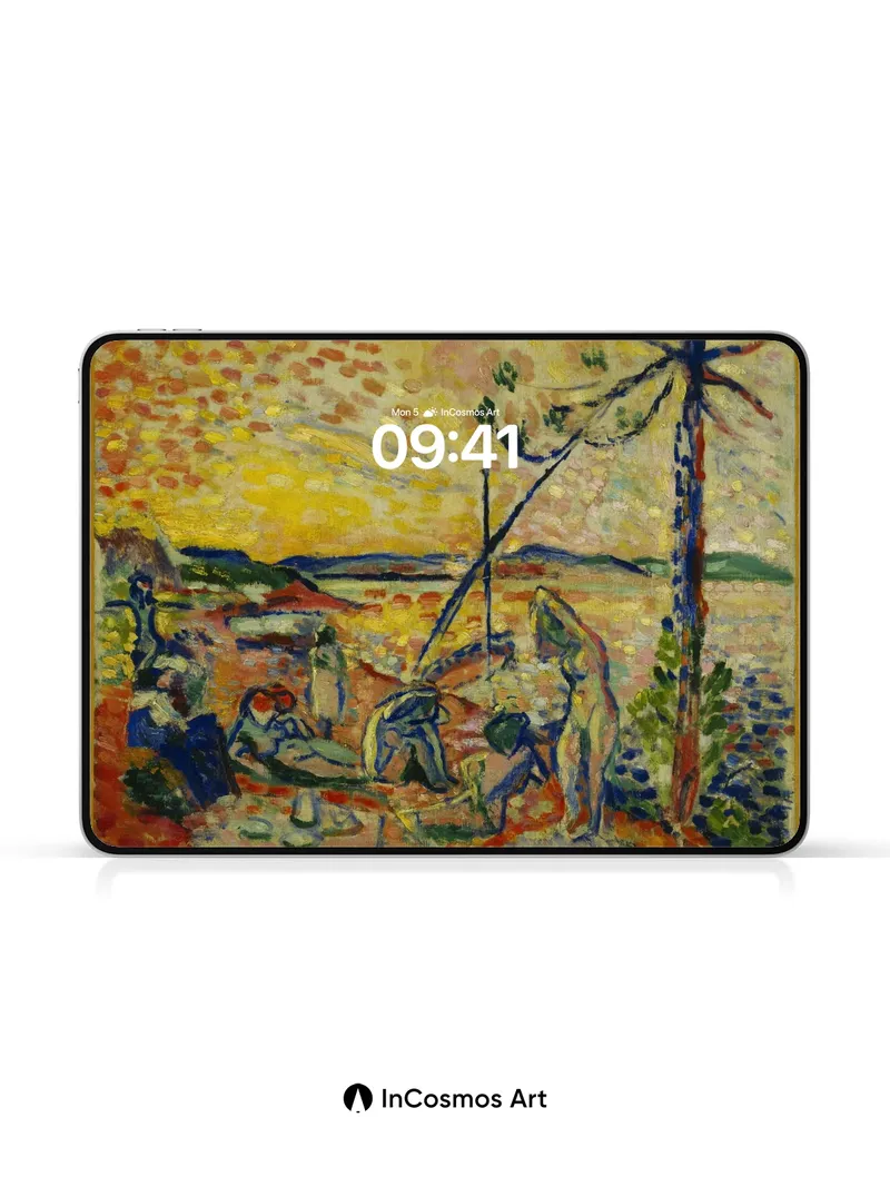Debug page_description: Did you know that Henri Matisse once said color was the key to emotional expression? Here, golden light bleeds across a sunbaked landscape where figures lounge beneath a trembling palm, their forms dissolved into bold strokes of ochre, cerulean, and jade. The brushwork hums like a warm breeze, each dot of pigment pulsing with life, as if the scene itself is breathing in rhythm with the heat. Share this with your best friend. Send this to your love and swap a matching set. What if every room could whisper secrets from a painter’s soul?