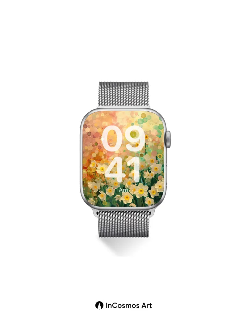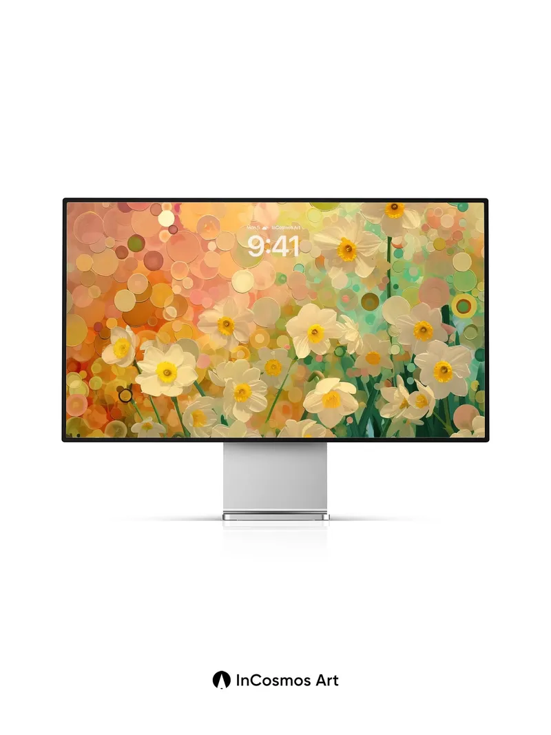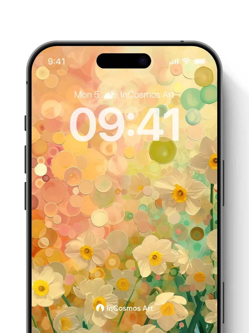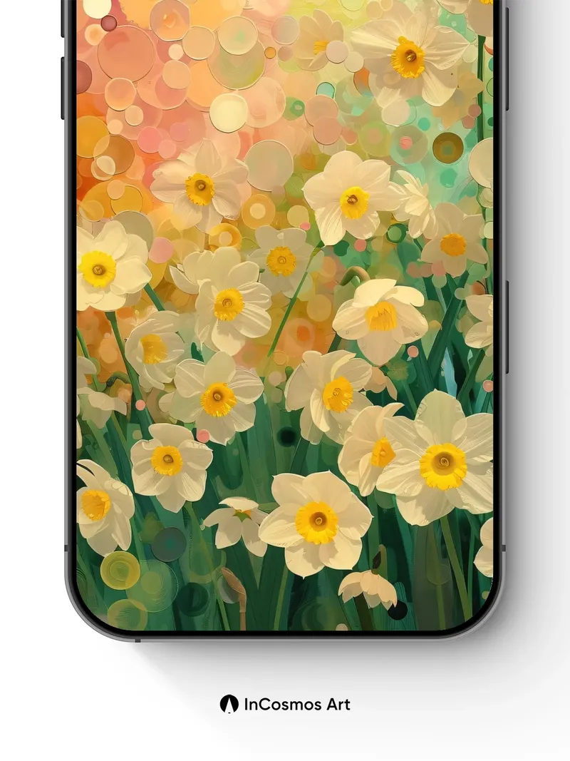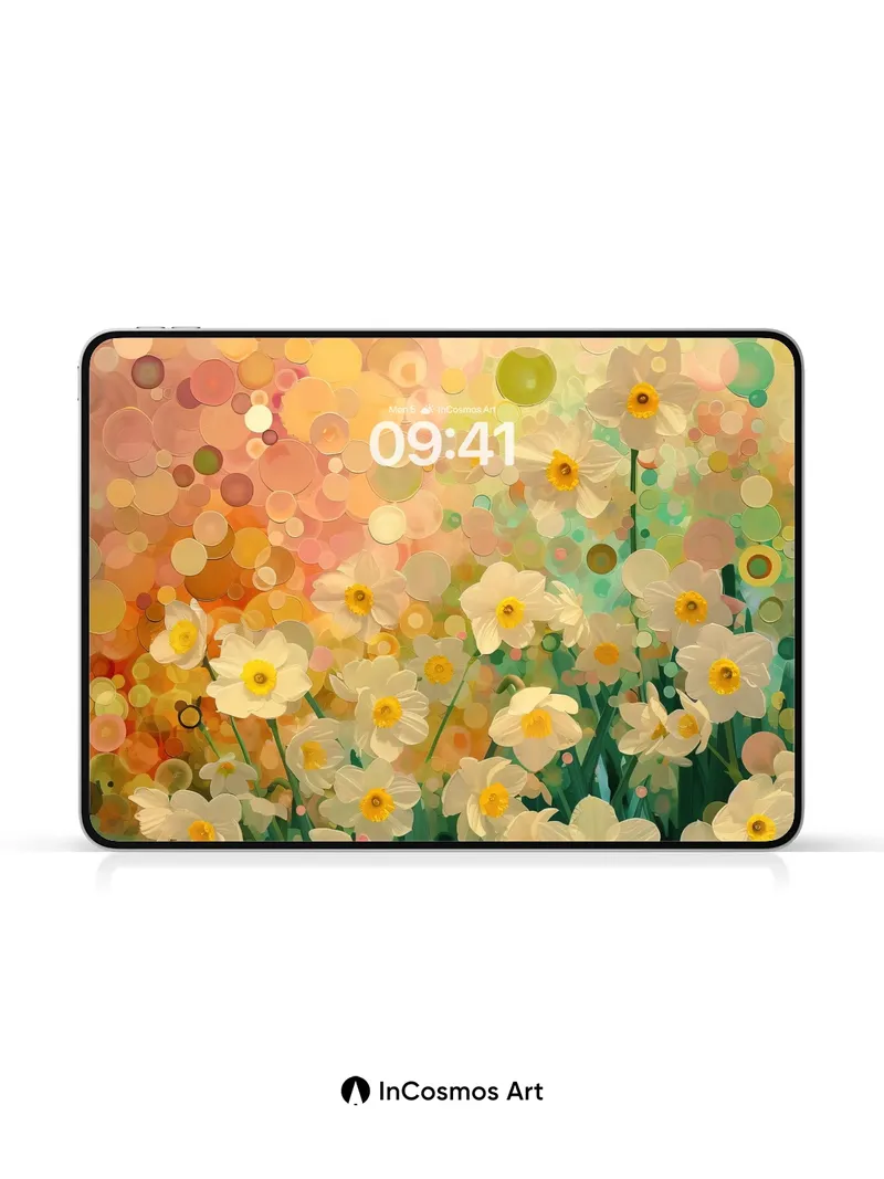 Sunlit Daffodil Field Wallpaper with Floating Light Circles