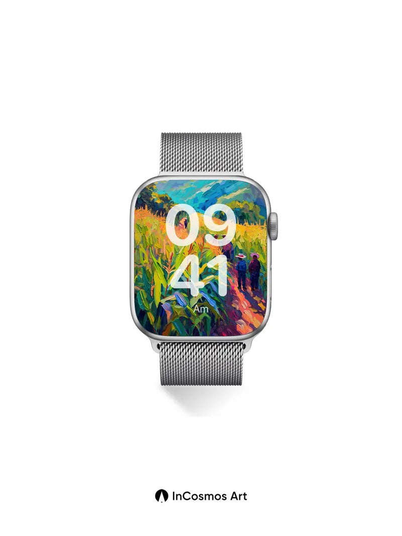 Debug page_description: Did you know that cornfields in Mexico once served as living calendars for ancient farmers? Here, golden stalks pulse with heat-hazed light, their emerald leaves trembling like stained glass under a sky of swirling cerulean and lavender. A trail of figures in wide-brimmed hats walks into the distance, their shadows painted in molten crimson—each step echoing through fields where color doesn’t just exist, it breathes. Share this with your best friend. Send this to your love and swap a matching set. What if every path you walked left behind a painting?