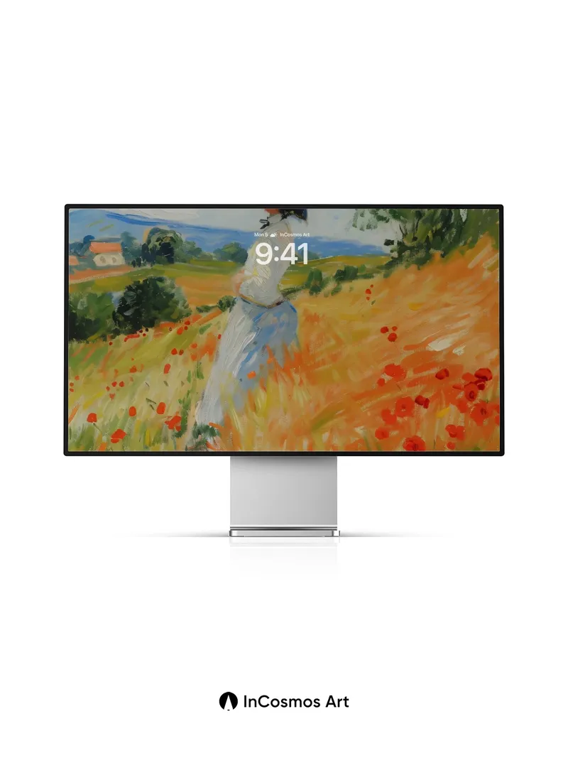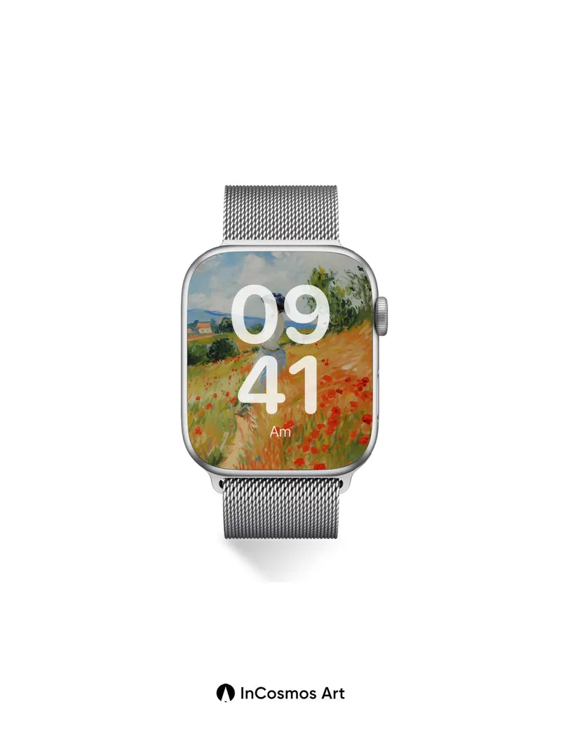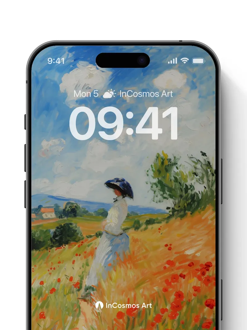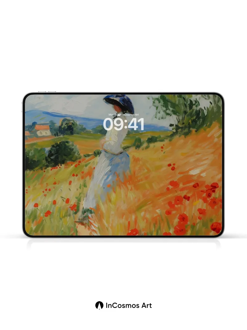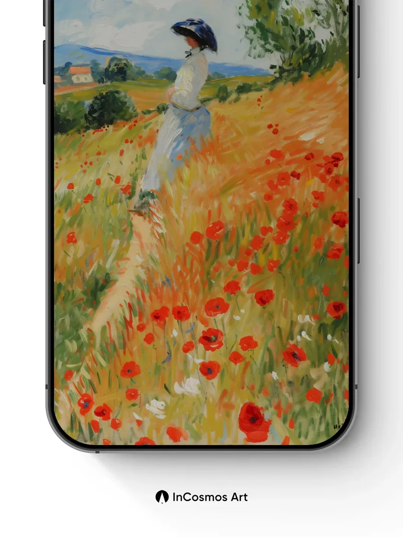 Debug product.metafields.custom.desc: Did you know Monet once painted the same field at different times of day to capture light’s fleeting dance? Here, golden grasses sway like silk under a sky brushed with cerulean and cloud-soft breath. A lone figure in a wide-brimmed hat walks into the horizon, where poppies bloom in crimson clusters that pulse with quiet life. The wind carries their scent through the air, and time slows as color breathes across the canvas.