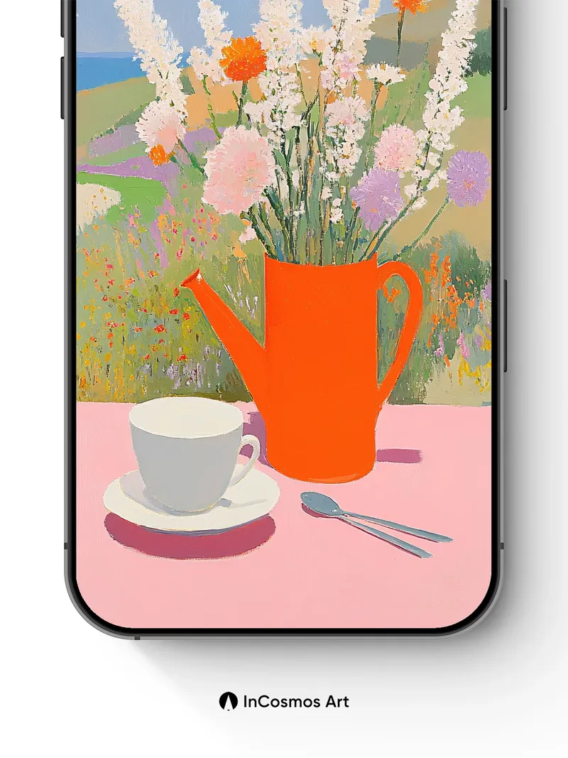 Debug page_description: Did you know that light, when caught in pigment, can mimic the warmth of a summer breeze? Here, it dances across a terracotta jug brimming with wildflowers—white spikes and coral blooms—set against a hazy coastal vista where sky bleeds into field. A white cup rests quietly on pink, its shadow a whisper of stillness. The scene breathes like a paused moment: tea left untouched, wind holding its breath. Share this with your best friend. Send this to your love and swap a matching set. What if silence had a color?