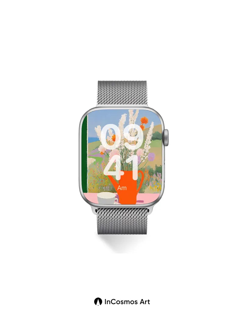 Debug product.metafields.custom.desc: Did you know that light, when caught in pigment, can mimic the warmth of a summer breeze? Here, it dances across a terracotta jug brimming with wildflowers—white spikes and coral blooms—set against a hazy coastal vista where sky bleeds into field. A white cup rests quietly on pink, its shadow a whisper of stillness. The scene breathes like a paused moment: tea left untouched, wind holding its breath.