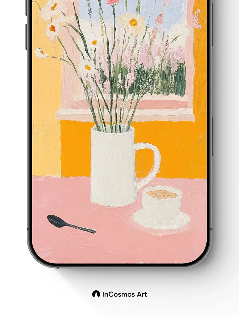 Debug product.metafields.custom.desc: Did you know that daisies were once used in ancient rituals to symbolize innocence and purity? Here, they rise like quiet prayers from a white pitcher, their stems slender and green against the golden wall, while soft light spills through the window like honey over cotton. The coffee cup hums with warmth, untouched, as if time paused just for this moment—where color breathes and silence sings.