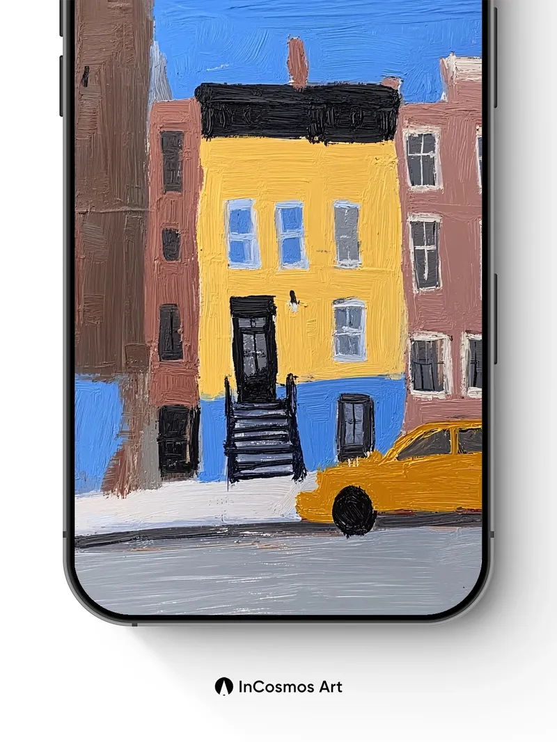 Debug og_description: Did you know New York’s iconic yellow cabs were originally painted that color to match the city’s first electric taxis? Here, light dances across textured paint like a brushstroke memory, where every window holds a quiet story and the sky breathes in bold cerulean. The buildings stand close, almost whispering secrets, their edges softened by hand-applied pigment—like time itself paused for a moment of stillness.