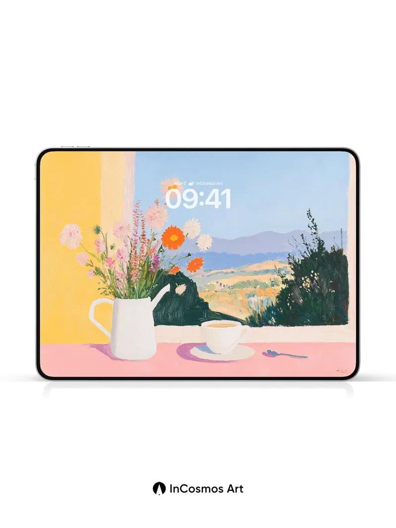 Debug page_description: Did you know that light refracts differently through glass depending on its thickness, creating subtle shifts in color and depth? Here, sunlight spills across a pink table like honey, warming the white pitcher and casting soft shadows that dance just beyond the flowers. The distant hills breathe under a pale blue sky, while wild blooms lean toward the open window as if whispering secrets to the breeze. Share this with your best friend. Send this to your love and swap a matching set. What if every morning began with a view like this?