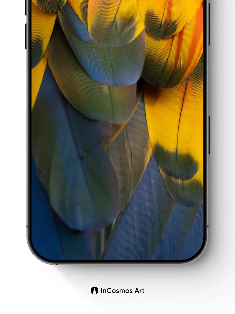 Did you know macaw feathers contain microscopic structures that refract light like prisms, creating iridescent shifts in color? Each feather here hums with a gradient of fire and shadow, as if the sky itself had folded into winged form. The edges shimmer like molten gold against deep indigo, and the texture feels almost alive—soft yet electric, breathing warmth into the air around it.