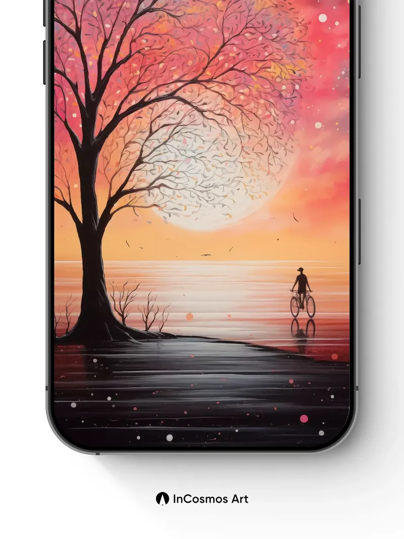 Debug og_description: Did you know the color of a sunset can shift by up to 15 nanometers in hue as light scatters through atmospheric particles? Here, that science dances into myth: a lone tree bleeds autumn leaves into a sky where stars pulse like distant embers. A cyclist rides across still water, their silhouette mirrored in liquid glass beneath a moon that glows not from reflection, but from memory.