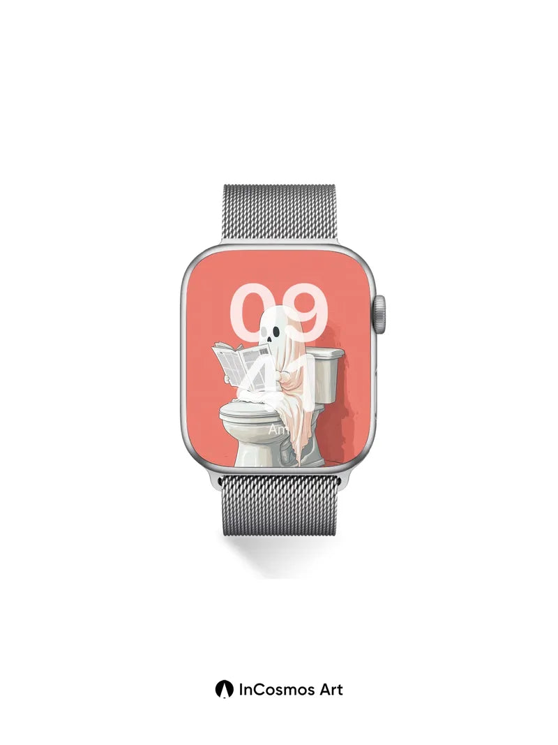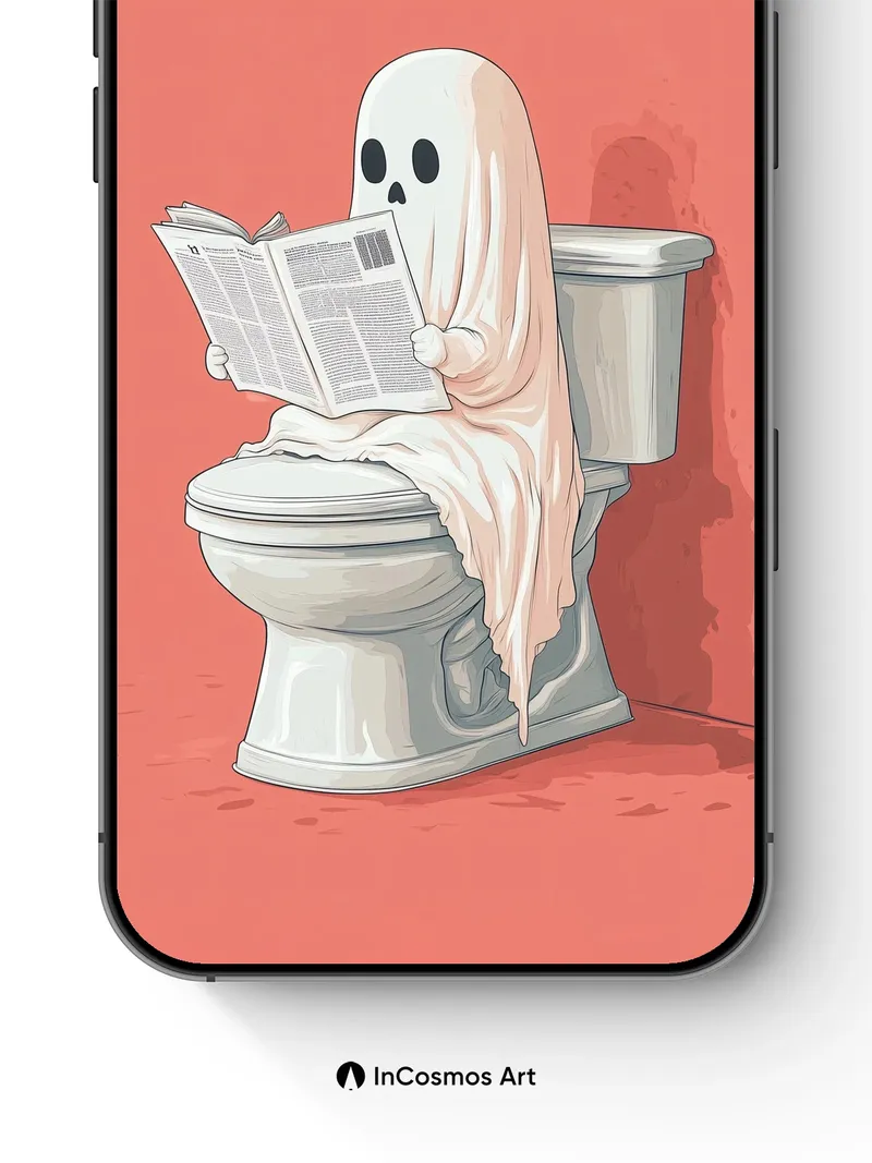 Debug product.metafields.custom.desc: Did you know ghosts in folklore were once believed to be trapped between worlds, lingering over mundane tasks like reading newspapers? Here, a translucent figure sits calmly on a porcelain throne, wrapped in sheet-like fabric that drapes like liquid silk, absorbed in inked columns beneath soft coral light. The scene hums with quiet absurdity—where the afterlife meets daily ritual, and silence speaks louder than words.