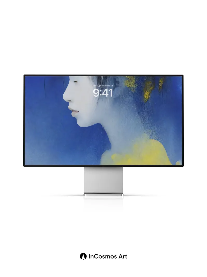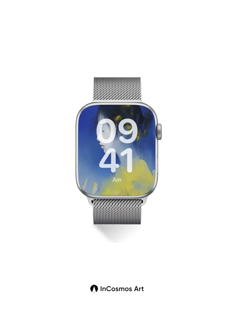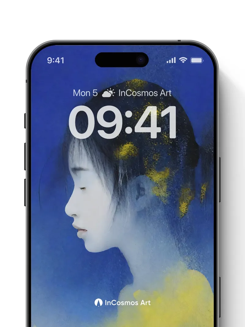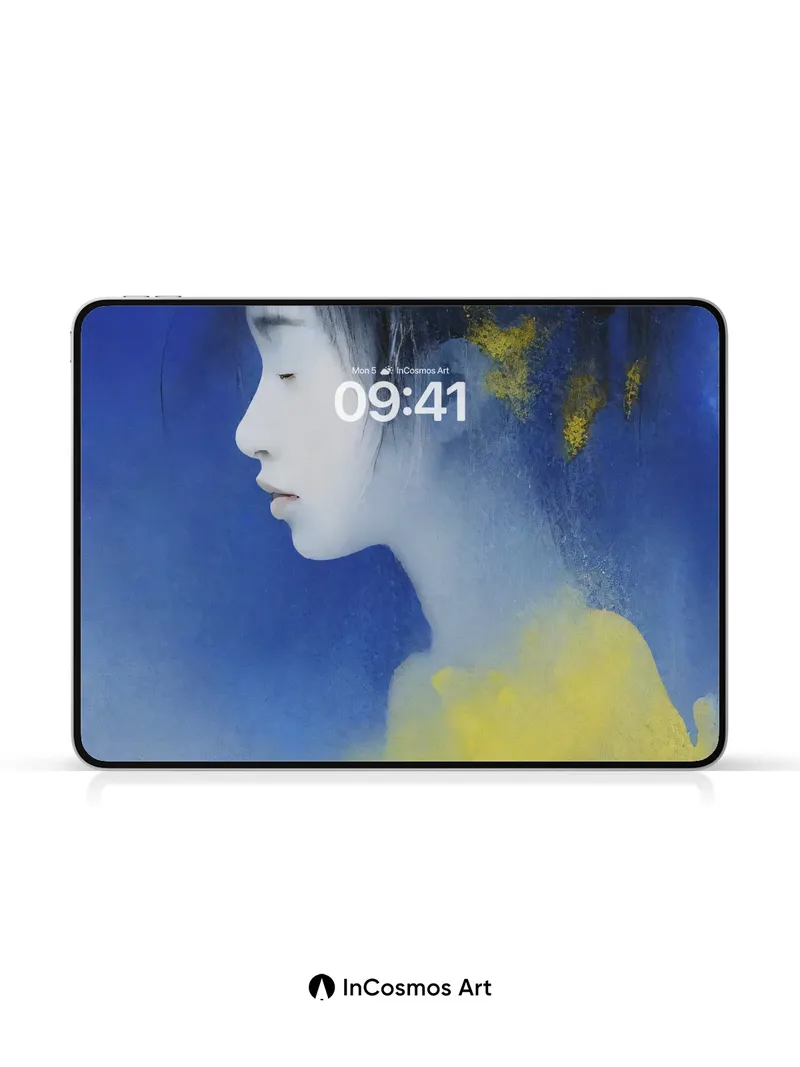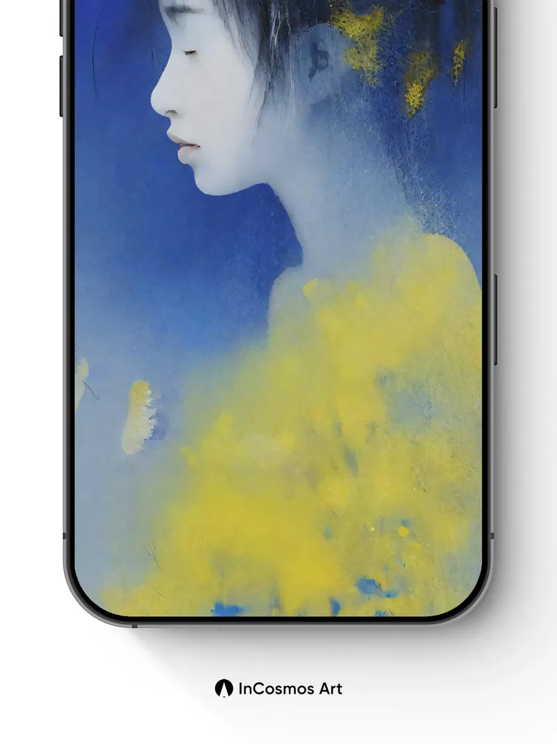Debug product.metafields.custom.desc: Did you know that in Japanese ink painting, the absence of color speaks louder than any brushstroke? Here, a young woman’s profile emerges from deep Klein blue like a memory half-remembered, her silhouette brushed with flecks of gold as if stardust had settled in her hair. The yellow fog curls around her shoulders like breath held too long—soft, luminous, alive.